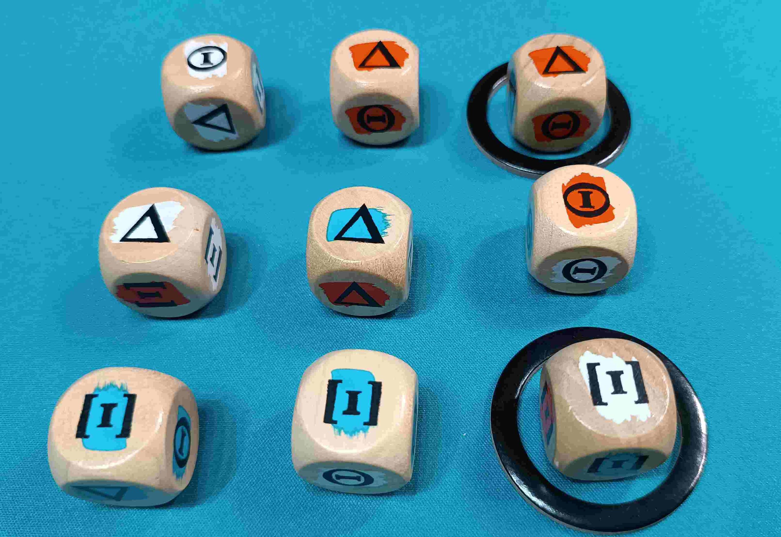 Dentro de ella nos vamos a encontrar con los 9 dados marrones en madera, muy livianos y con caras que muestran o algún color (azul, blanco o naranja) o bien una letra griega (Θ (Theta), Δ (Delta) y Ξ (Xi)), un puñado de cartas de entre las cuales destacan las 12 que son para los jugadores que el tienen el reverso de pizarra blanca lo que permite escribir y borrar de una partida a otra, y unos cuantos marcadores, un par de aros y un par de rotuladores para que los jugadores puedan escribir sus palabras clave.