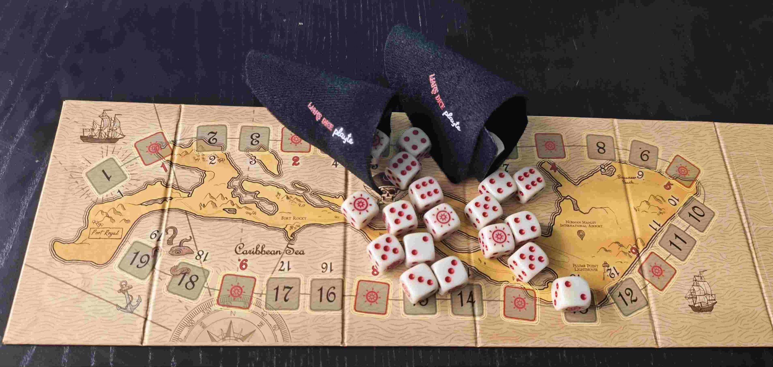 Playte ofrece una versión elegante y compacta, con una caja magnética que se despliega como tablero y cubiletes plegables de velcro que sustituyen a los tradicionales vasos de dados. Tanto los dados personalizados como el tablero incluyen símbolos que refuerzan el tono pirata, homenajeando además su aparición en Piratas del Caribe. Todo cabe en una caja que invita a llevarlo a cualquier parte.