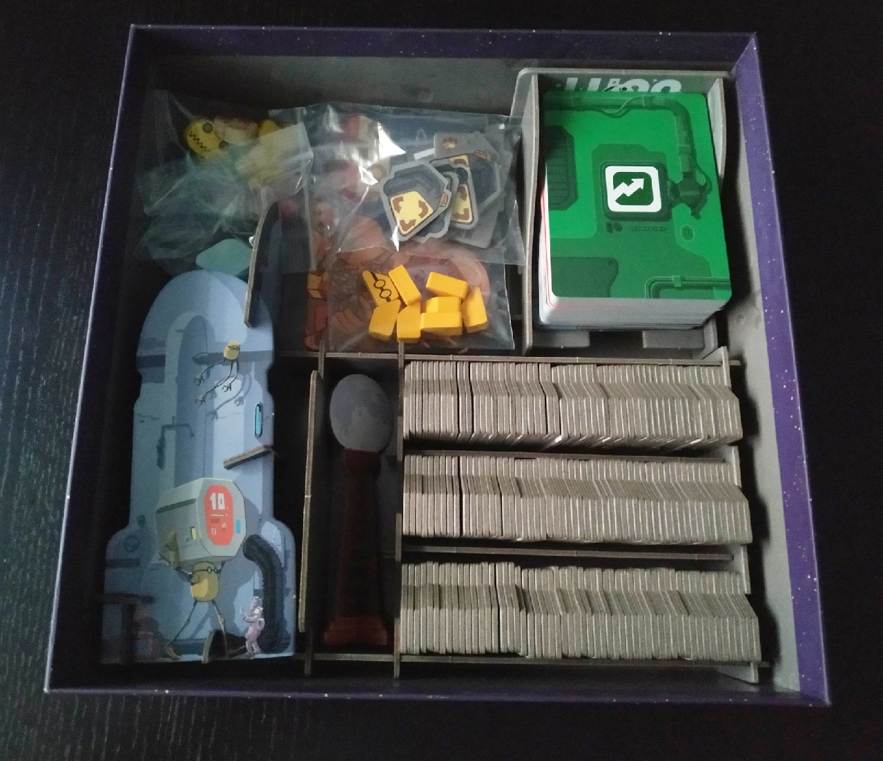 En este caso no solo cuenta con unas losetas, unas cartas y unas fichas de grandes calidades sino que, además, cuenta con diferentes troqueles de cartón para construir su propia cuna para almacenar los componentes, un dispensador de cartas y la joya de la corona: un troquel para fabricar su propio cohete espacial que hará las veces de dispensador de losetas en la partida. No solo queda bien artísticamente sino que son elementos que ayudan a la preparación de la partida y al desarrollo del juego.
