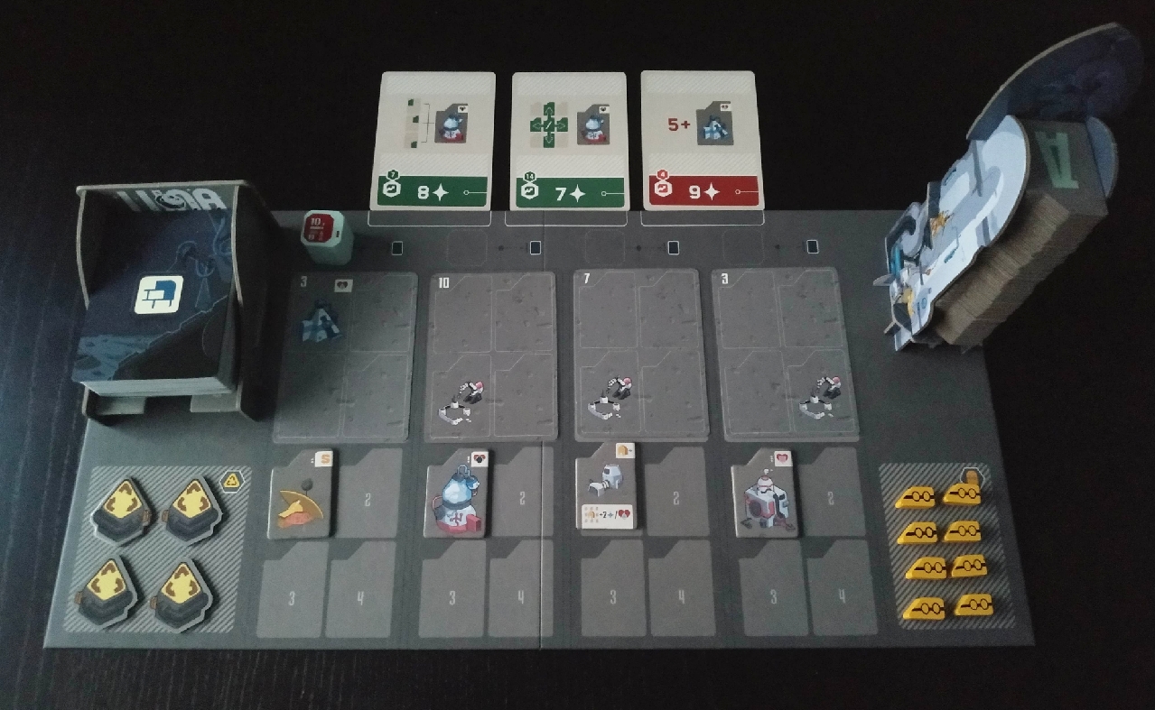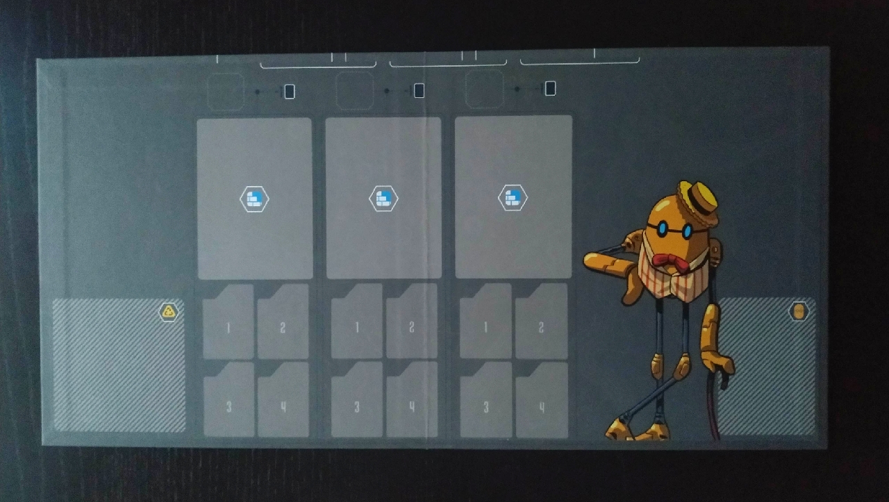 - Colocad el tablero por el lado con cuatro espacios en la fila de cartas del tablero y colocad una carta del mazo de planos de construcción boca arriba en cada uno de los cuatro espacios disponibles, dejando el resto del mazo de construcción en el dispensador a un lado del tablero.
