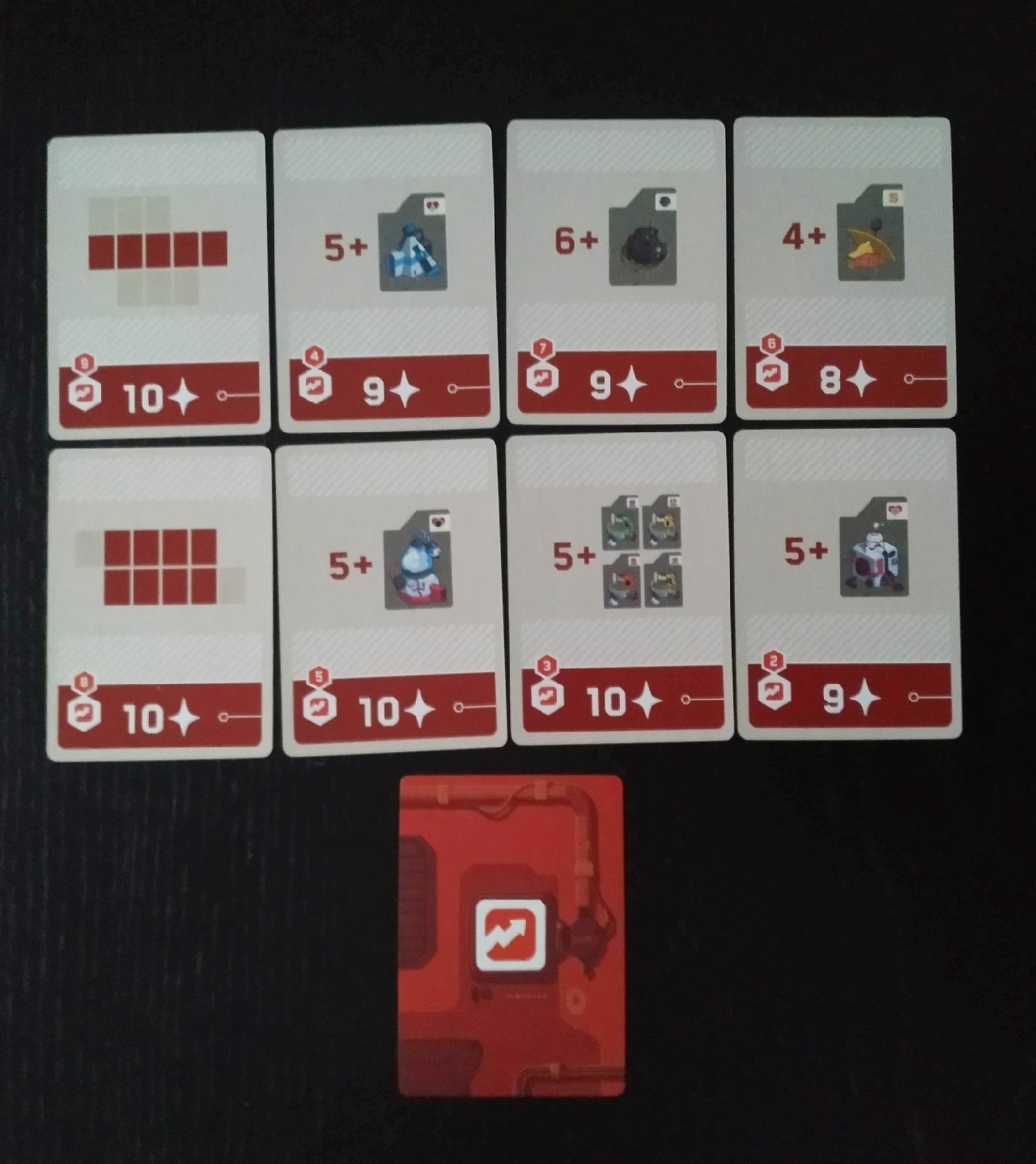 - Las cartas de planos de construcción están numeradas del 1 al 10. En cada fila, los números de las cartas deben ser ascendentes de izquierda a derecha, y sin repetir el valor. Si no se puede poner ninguna carta cumpliendo esta condición, deberá ponerse una de las cartas de la mano boca abajo (cumpliendo las condiciones 1, 2 y 3). Al no tener un número visible, no se tendrá en cuenta en este aspecto, ni se podrá colocar ninguna loseta de proyecto encima.