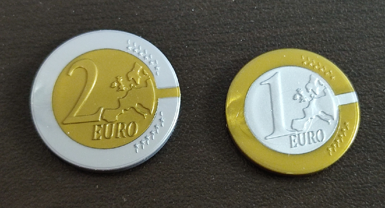 Otro de los componentes del juego es el dinero. Por un lado tenemos los clásicos billetes tipo monopoly de 5, 10 y 20 euros y, sobre todo, por el otro lado, tenemos otra de las estrellas del juego, las monedas. Son monedas de 1 y de 2 euros que tienen un buen realismo ya que tanto el tamaño como la apariencia están muy conseguidas.