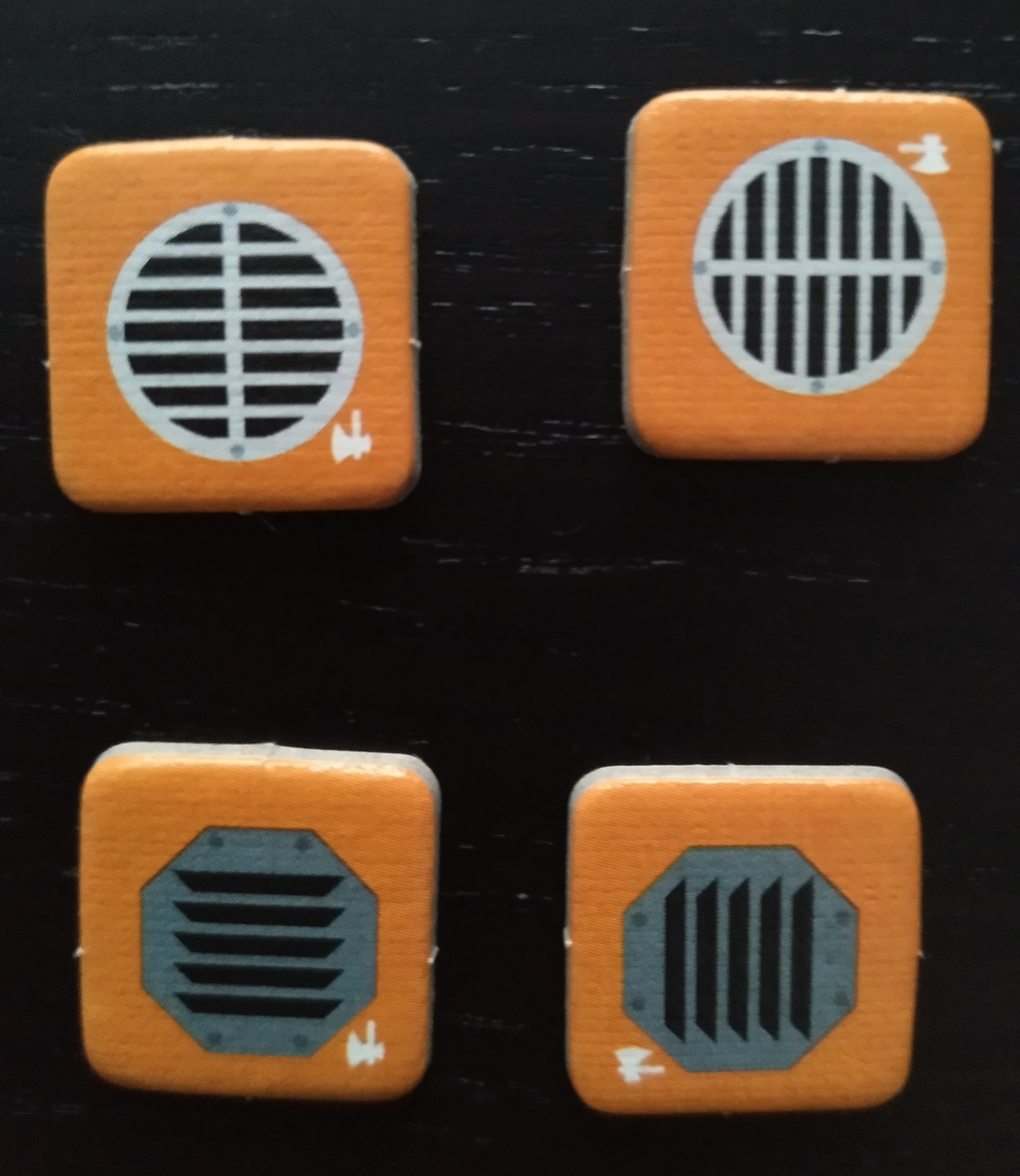 Tenemos disponibles 4 rejillas de ventilación naranjas (dos parejas, con formas distintas, cosa que debemos tener en cuenta porque deben usarse en pares). En cualquier momento, cualquier jugador que decida mover al enano (meeple naranja) puede coger una pareja de rejillas, colocar una donde esté el héroe naranja y la otra en cualquier casilla vacía del centro comercial.