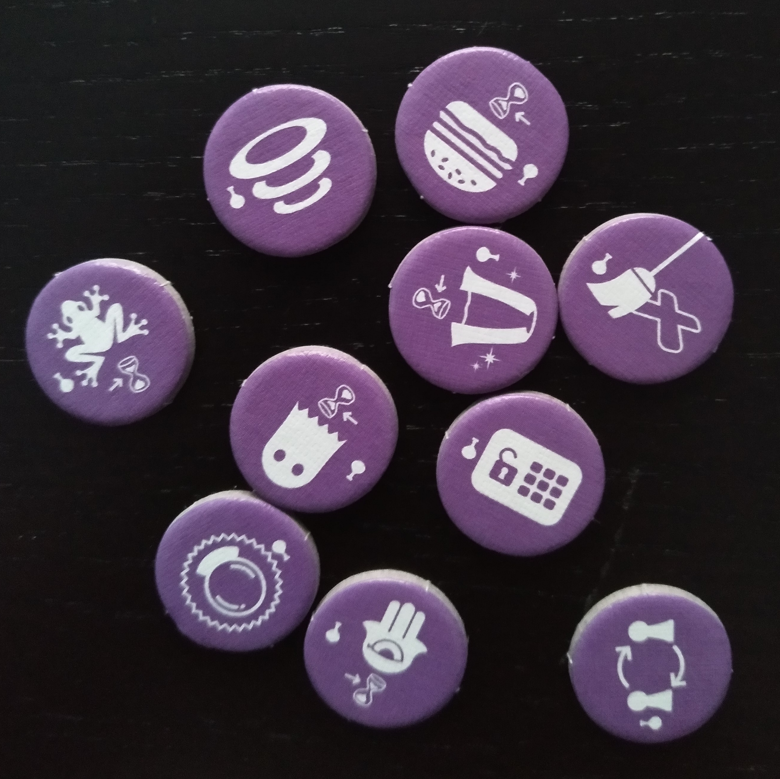 Mientras preparemos el juego, cogeremos 2 de los 10 marcadores de hechizo al azar y los dejaremos a un lado de la zona de juego. Durante el juego, cualquier persona puede usar los hechizos de la maga, meeple morado, cogiéndolo y descartándolo tras su aplicación. Habrá que decir en voz alta el hechizo que se va a lanzar.