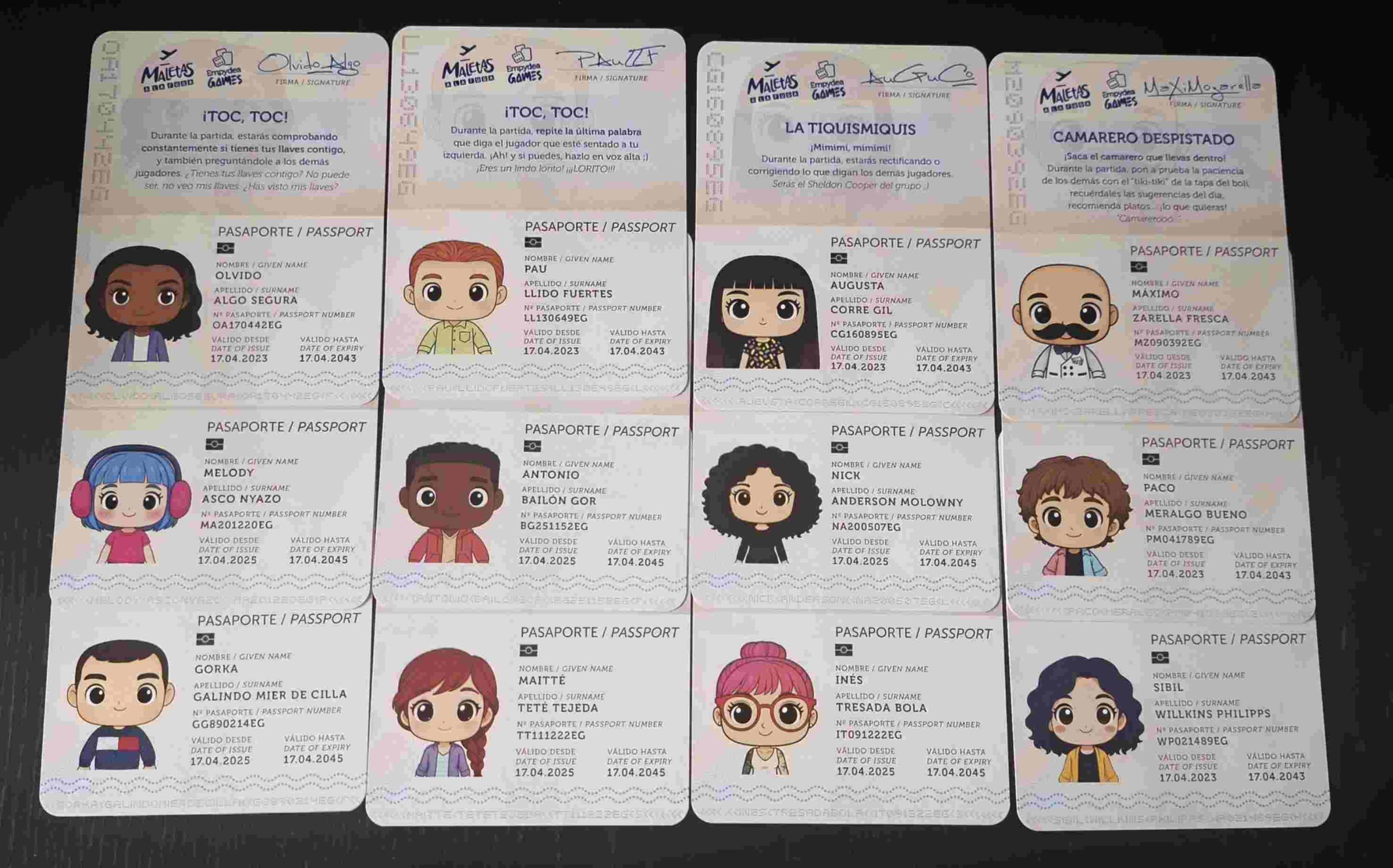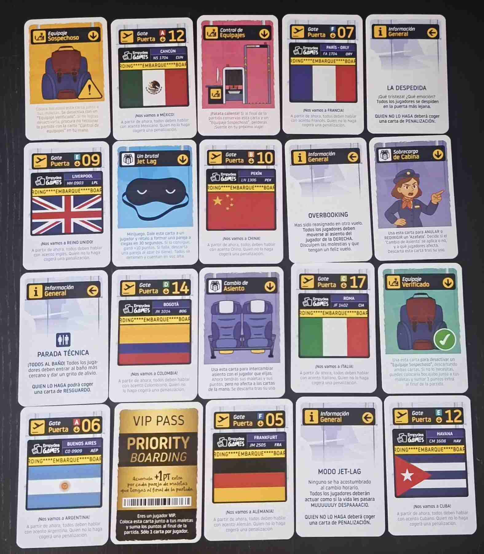 El juego incluye una gran cantidad de cartas con ilustraciones coloridas de maletas y efectos especiales, además de elementos curiosos como pasaportes con personalidad, una pelota antiestrés, un antifaz e incluye un QR con pistas de audio que ambientan la partida como si estuvieras en un aeropuerto.