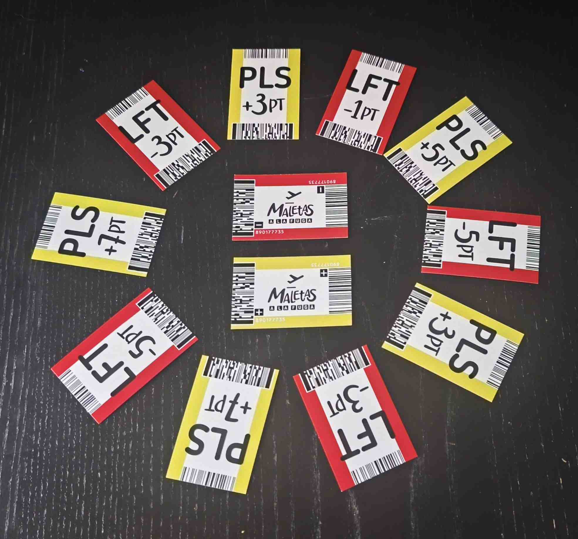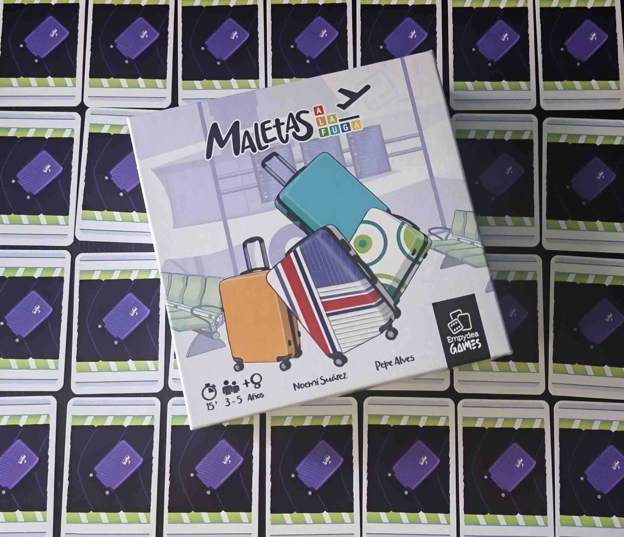 Maletas a la Fuga nos lleva a un aeropuerto completamente fuera de control donde todos los jugadores intentan recuperar equipajes antes de que acabe el tiempo. La mesa simula una cinta transportadora formada por cartas, de la que los jugadores roban mientras intentan formar parejas de maletas compatibles y colocarlas en su zona de juego para sumar puntos.