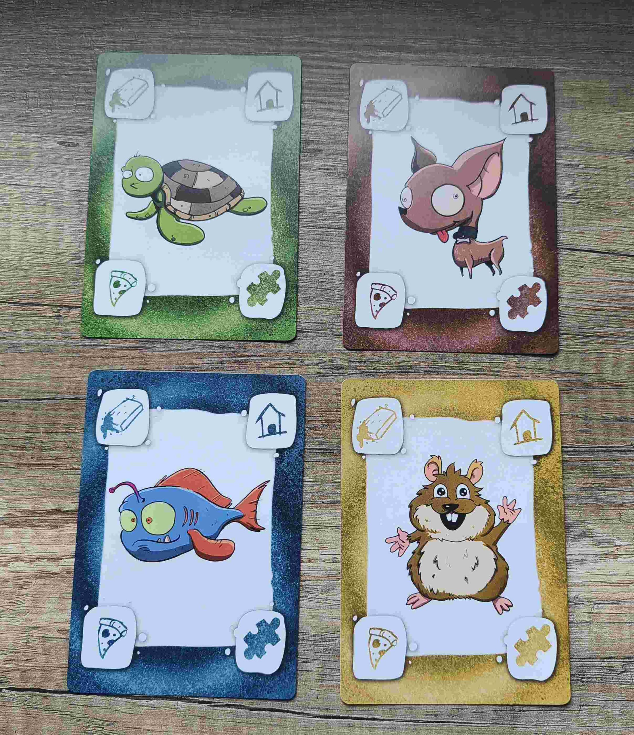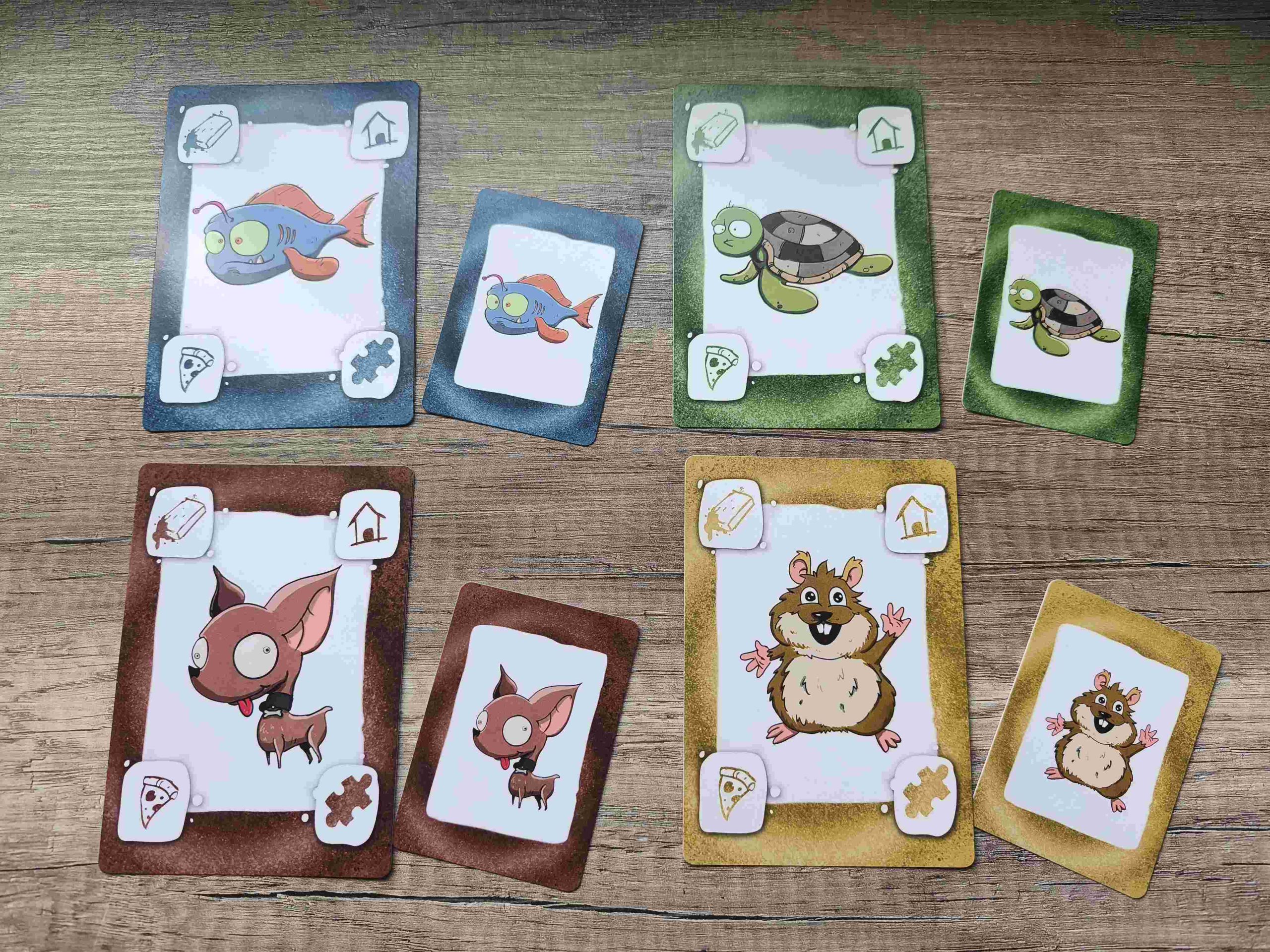 Después, colocaremos las 4 cartas grandes de mascota (un perro, una tortuga, un pez y un hámster) sobre la mesa y cada jugador robará 4 cartas del mazo de juego, dejando las demás formando un mazo boca abajo, sobre la mesa.