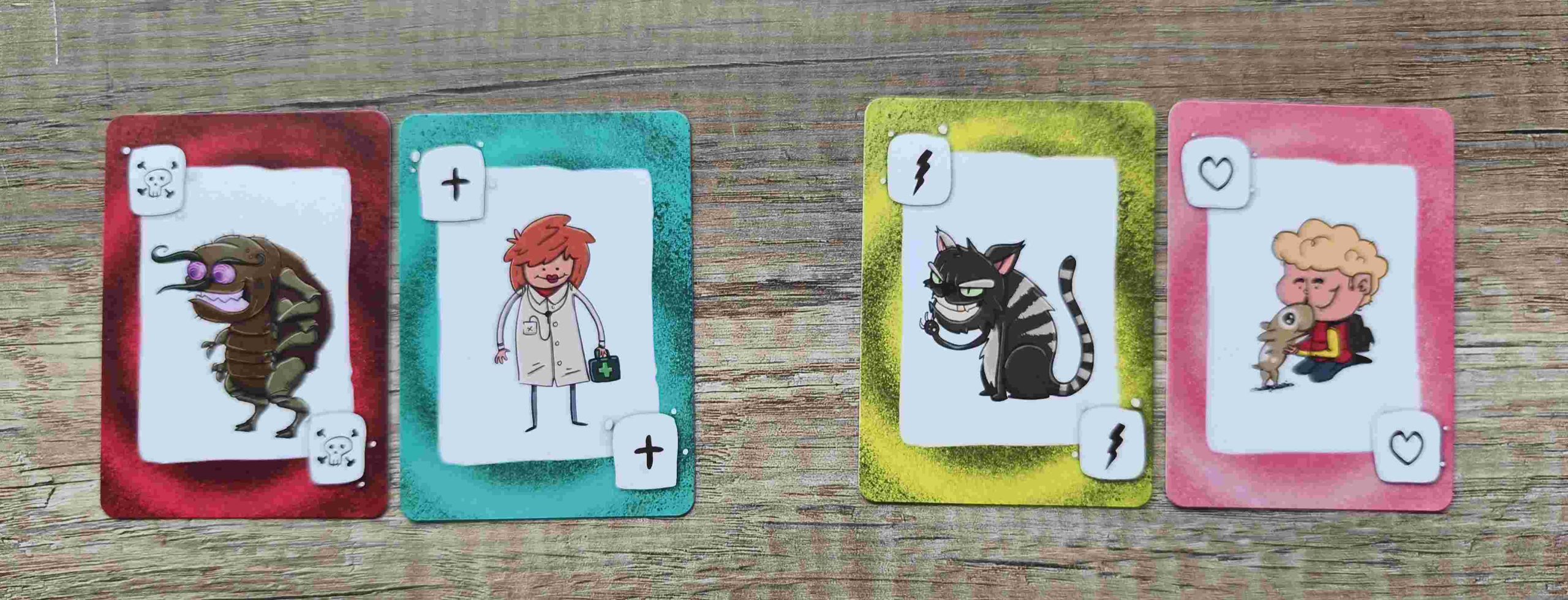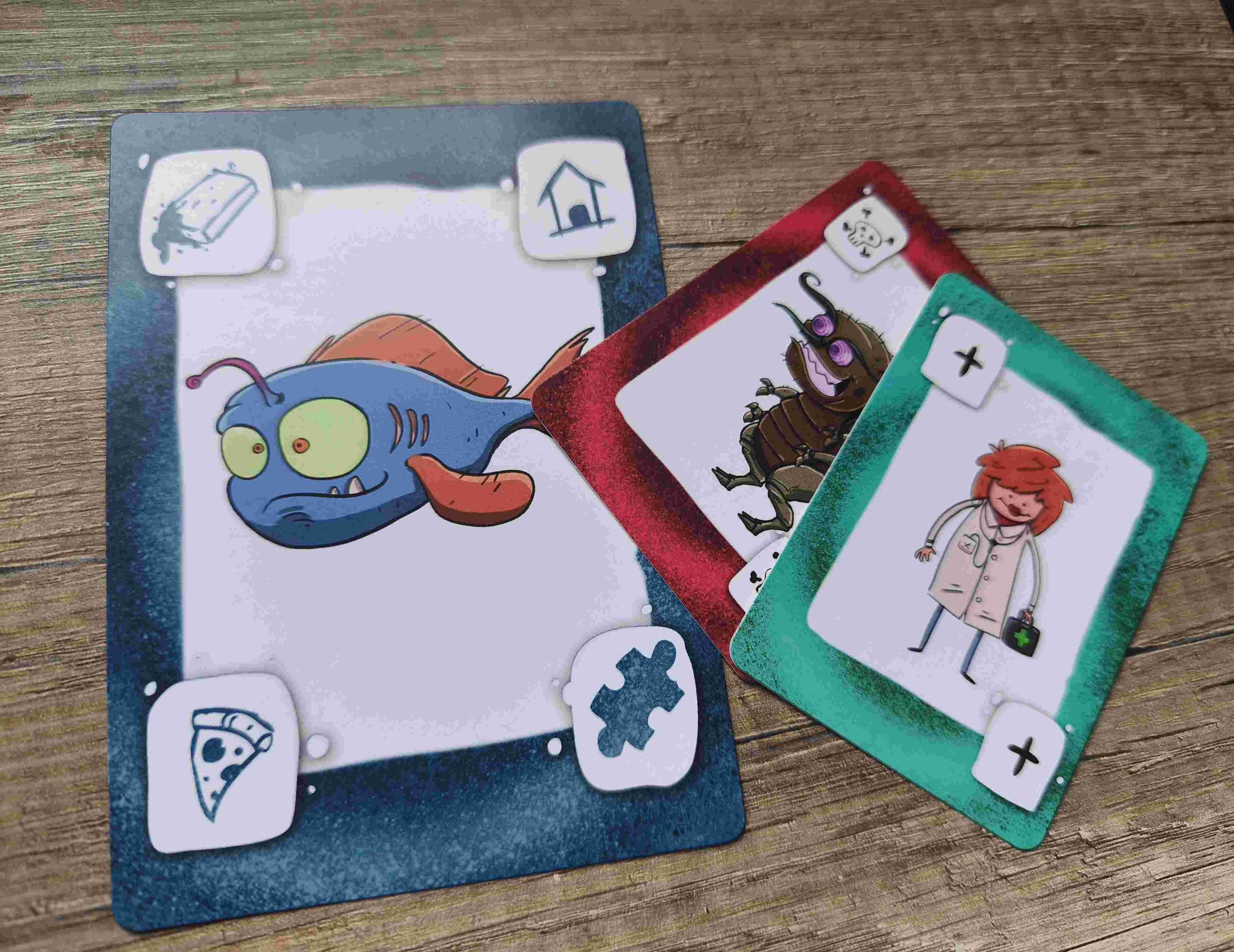 También podremos jugar una carta de estado o de acción para mejorar la situación de una mascota o empeorarla. Estas se colocarán encima de la carta grande, en los laterales.