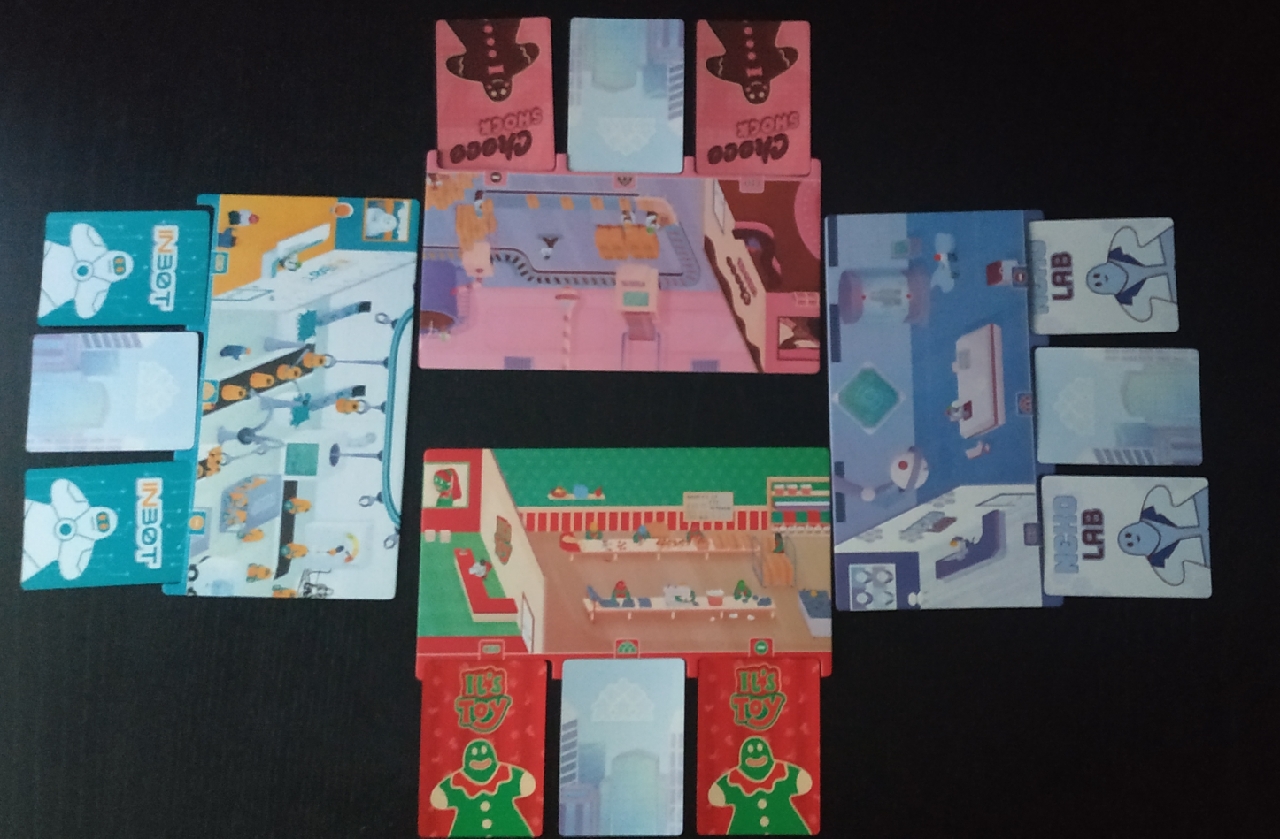 - Barajad las cuatro cartas de departamento principal y repartid una al azar a cada jugador. Este será su objetivo del departamento principal y deberá colocarlo, bocabajo, en su zona del tablero.