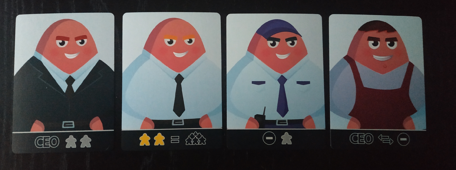 Además, el juego cuenta con un pequeño modo avanzado que consiste en cuatro personajes que se reparten al azar entre los jugadores al comienzo de la partida y que profundizan un poco más en este sentido del faroleo pudiendo tener contratado algún meeple prohibido, tener dos presidentes, cambiar de departamento hasta dos meeples amarillos o incluso intercambiar los objetivos de presidente y trabajador prohibido entre ellos.