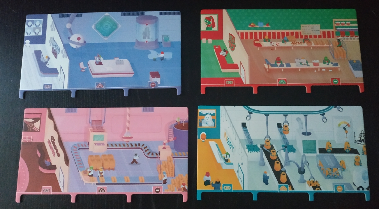 También nos encontramos, dentro de la caja, con todas las cartas, que cuentan también con ilustraciones sencillas pero muy funcionales, la ficha del marcador de jugador inicial, que es un reloj despertador y con la joya de la corona, los cuatro tableros de las cuatro empresas participantes. El diseño de estos tableros está muy cuidado y todos cuentan con detalles en las ilustraciones muy simpáticos. Si os fijáis bien encontraréis algunas anécdotas graciosas de sus trabajadores.
