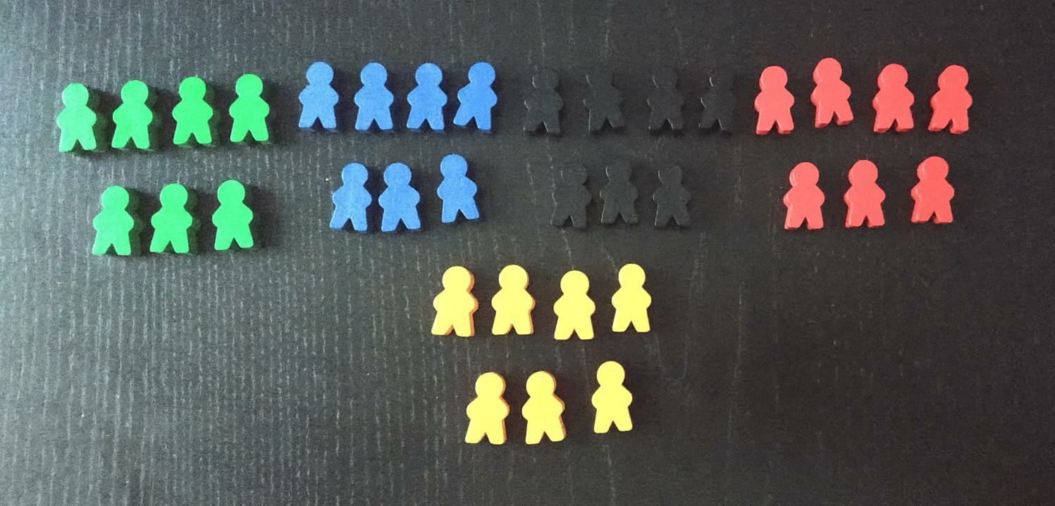 - Meted en la bolsa los siguientes meeples de cada color en función del número de jugadores: