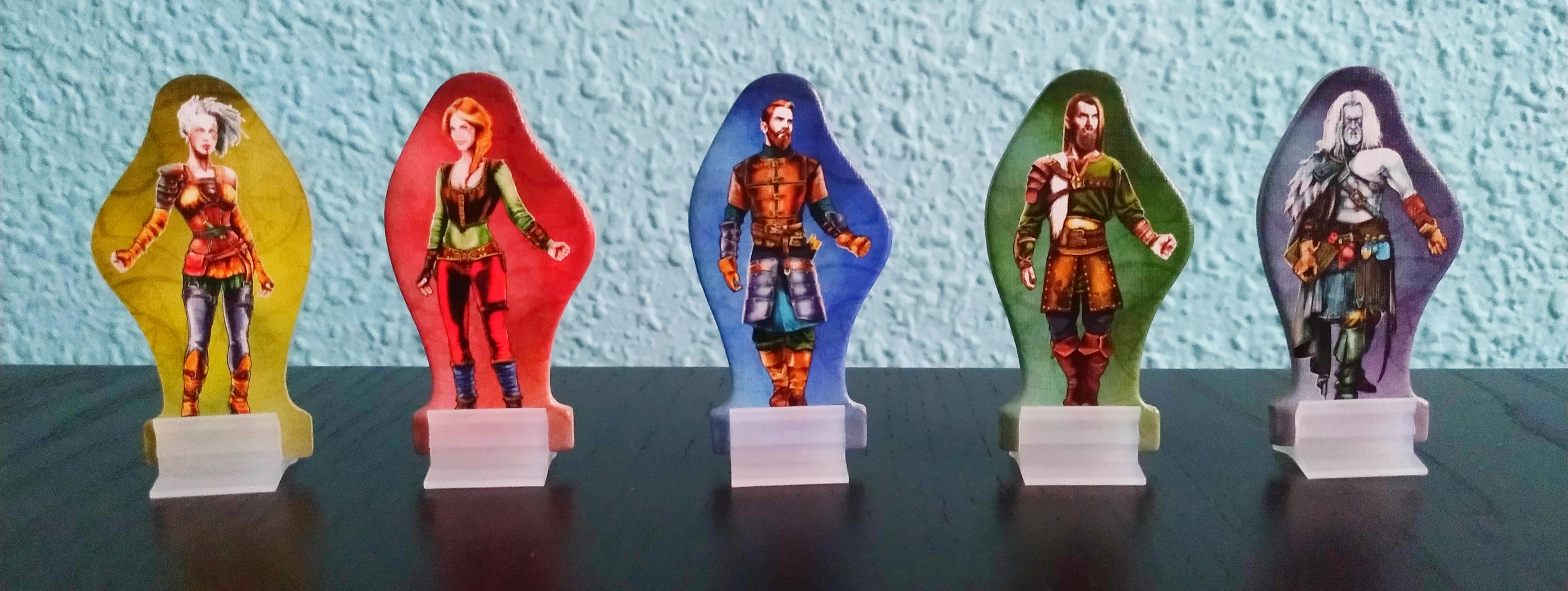 De todos estos componentes llaman especialmente la atención tres. Por un lado, el tablero. Colorido, bien ambientado y con una simbología que lo hacen muy accesible y práctico. Por otro, los tablerillos de personaje de cada jugador y la cantidad de combinaciones que se pueden hacer sobre ellos colocando las diferentes armas y armaduras con los que se pueden personalizar. Y por último, destacan todos los troqueles con peana de personajes y esbirros que pueden surgir durante la partida. Es cierto que, en lugar de éstos troqueles, se podrían haber fabricado miniaturas, pero todos sabemos que encarecería bastante el producto, siendo innecesario y quedando bien resuelto y conseguido de esta forma. Con respecto a su producción, incluyendo la gran cantidad de cartas y fichas de objetos que trae el juego, decir que son de buena calidad y con un buen grosor.