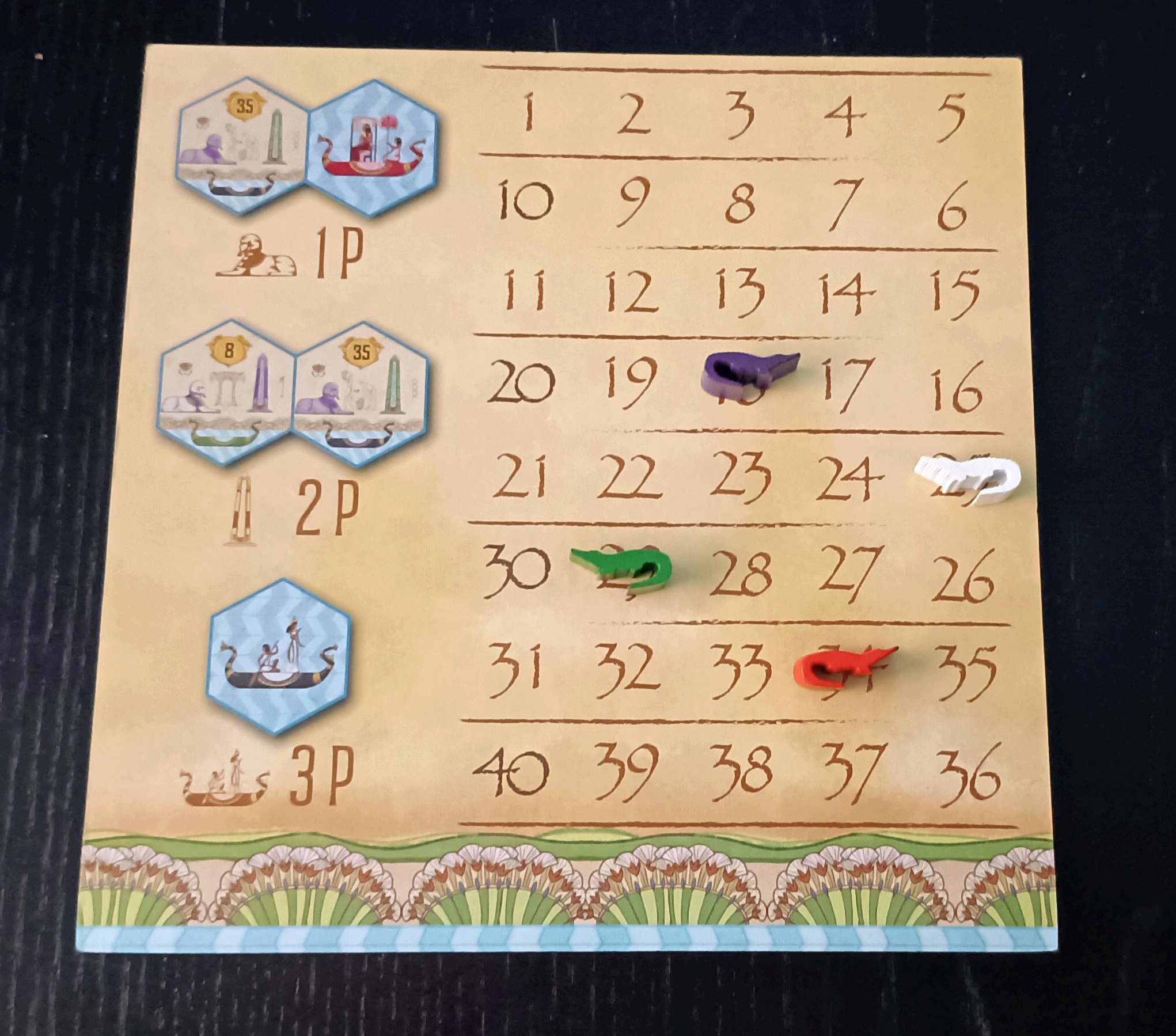 Cada participante irá sumando puntos viendo los elementos que sean de su color: Por las esfinges obtendremos un punto por cada loseta de río adyacente, por los obeliscos dos puntos y por los barcos, tres puntos.