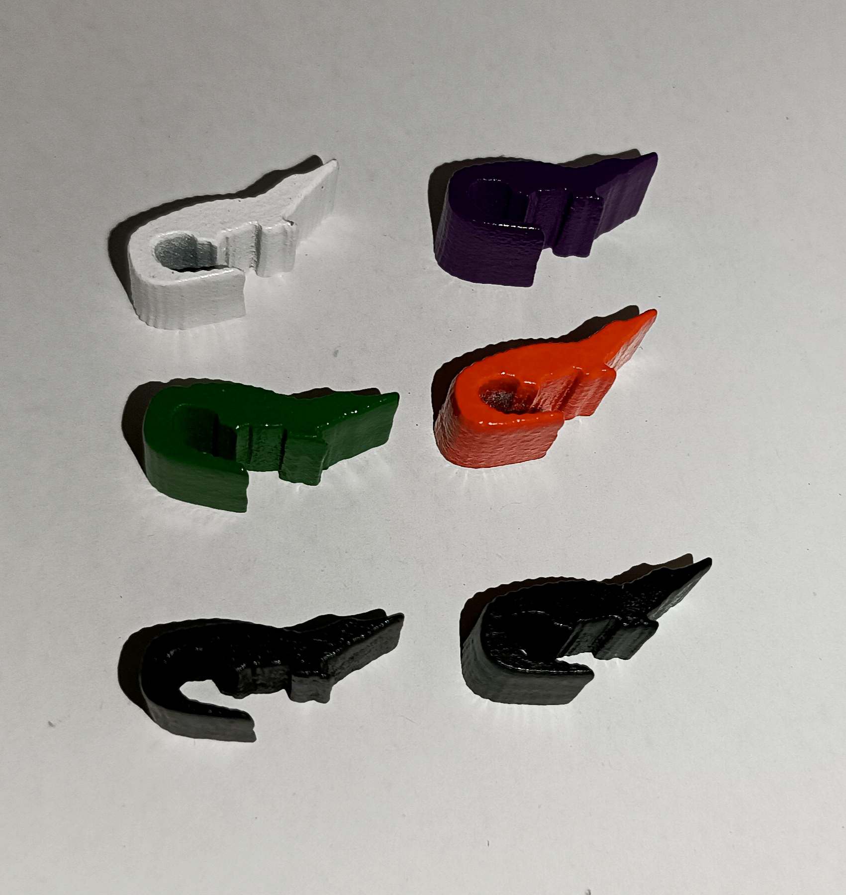 Por último, tenemos unos meeples de madera de diferentes colores en forma de cocodrilo, muy originales.