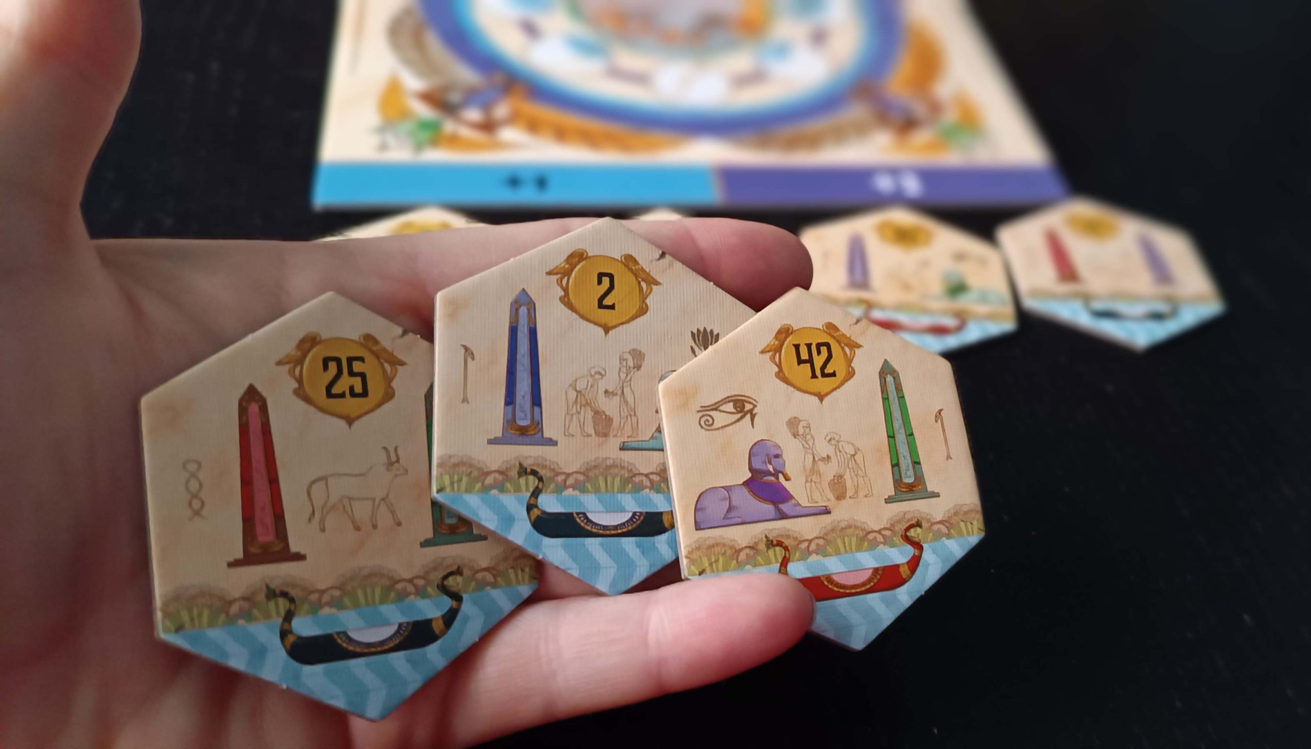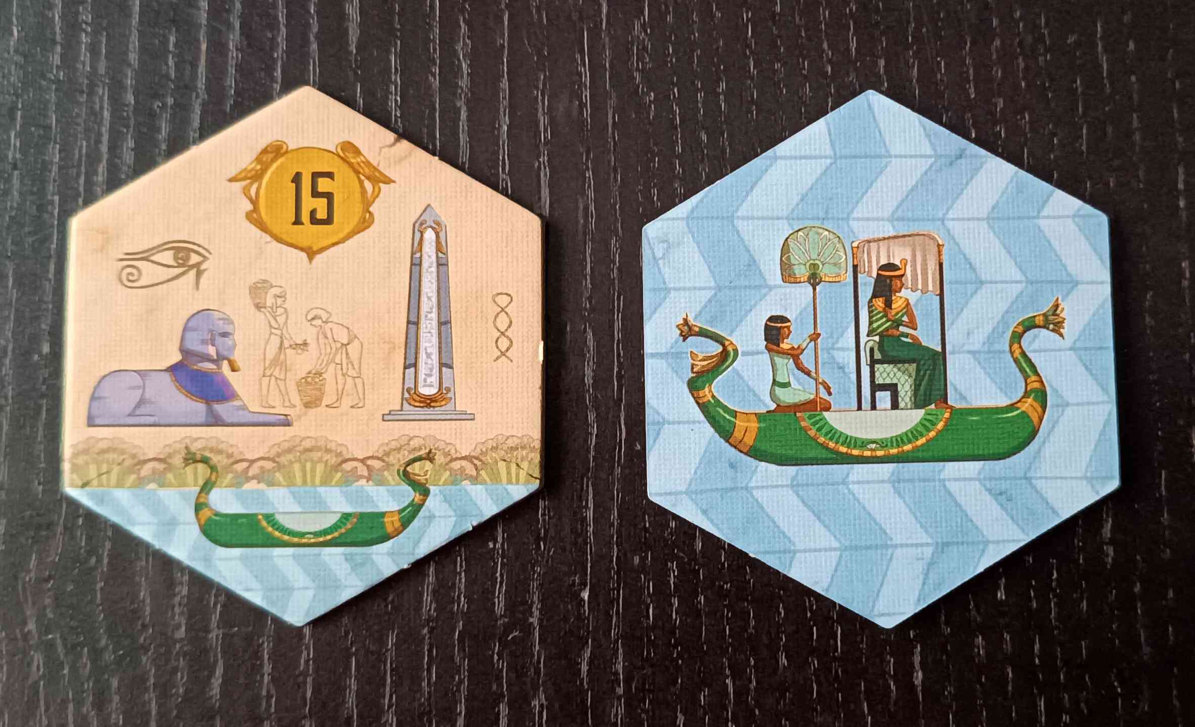 También tenemos una buena cantidad de losetas, del mismo buen gramaje que por un lado son azules y tienen barcos impresos con la cubierta de los colores de los diferentes jugadores y por el otro lado nos muestran un obelisco, una esfinge y el color de la cubierta del barco que veremos en el reverso.