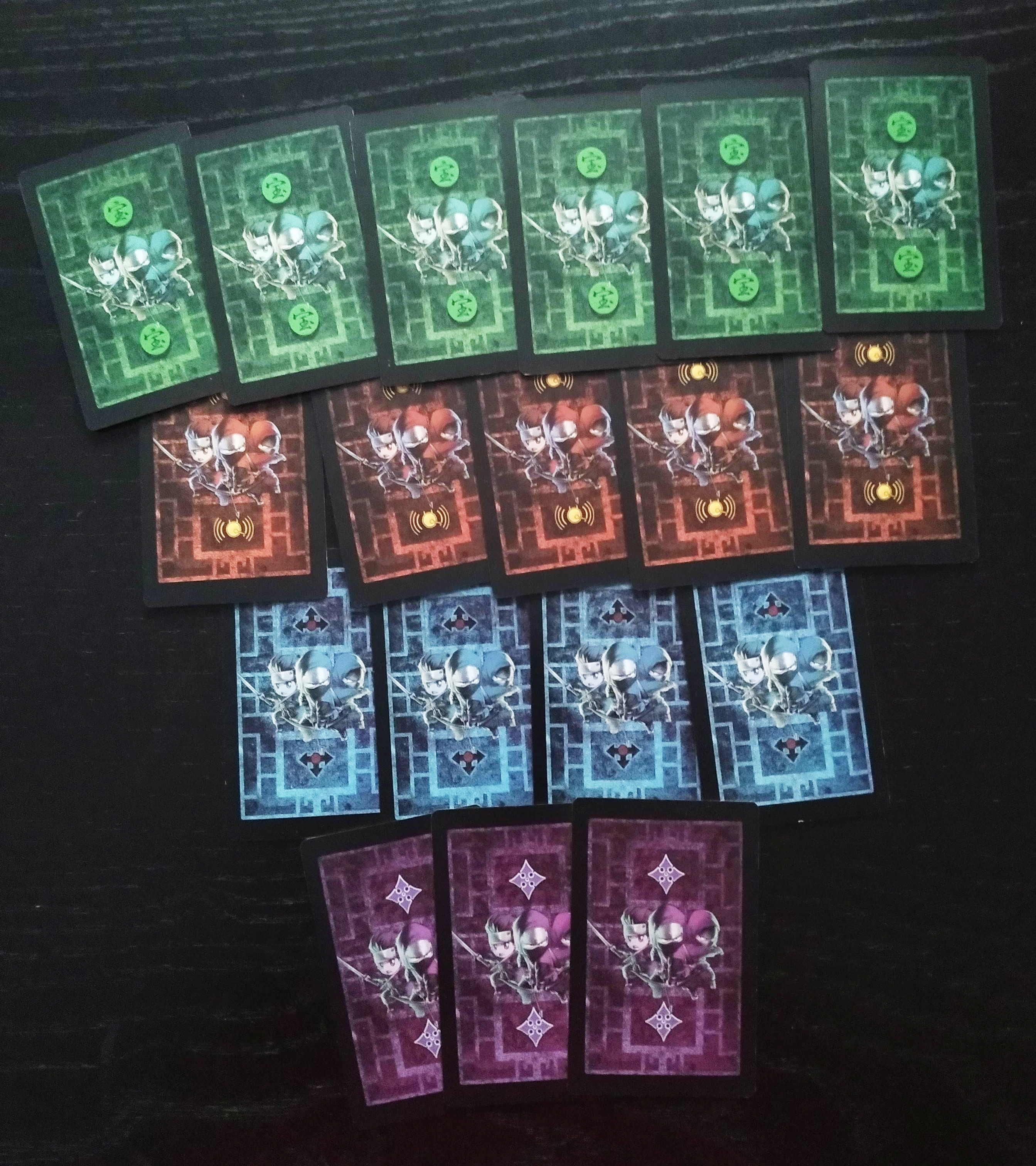 Por el otro, el hecho de que seamos 4 jugadores o menos y tengamos que crear de todos modos 4 mazos de movimiento, es algo muy interesante para aumentar las posibilidades de juego así como para hacer que cuando rotamos mazos no se sepa qué puede salirle al que la recibe, si el mazo no ha sido usado, porque si somos menos de 4 jugadores serán cartas que no han aparecido.