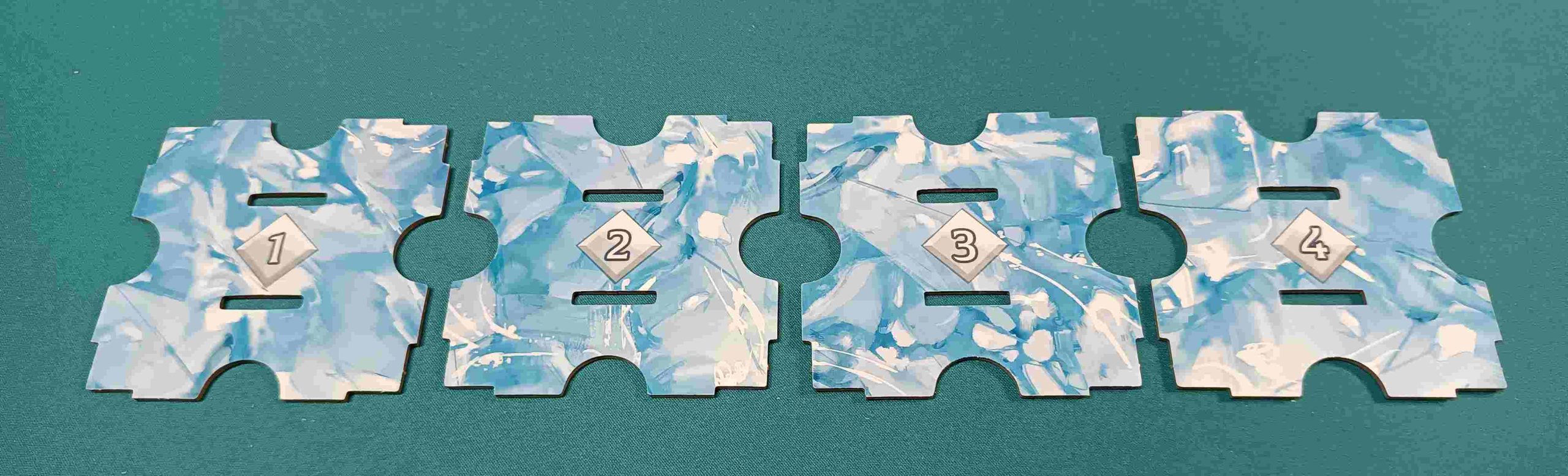 - Cúpula del templo: Quien haya colocado más bloques de hielo en las losetas de suelo del exterior del templo (losetas externas) se anotará 7 puntos y luego colocará la cúpula encima. Si hay empate, ganará el jugador que tenga más bloques en las losetas exteriores del nivel más bajo.