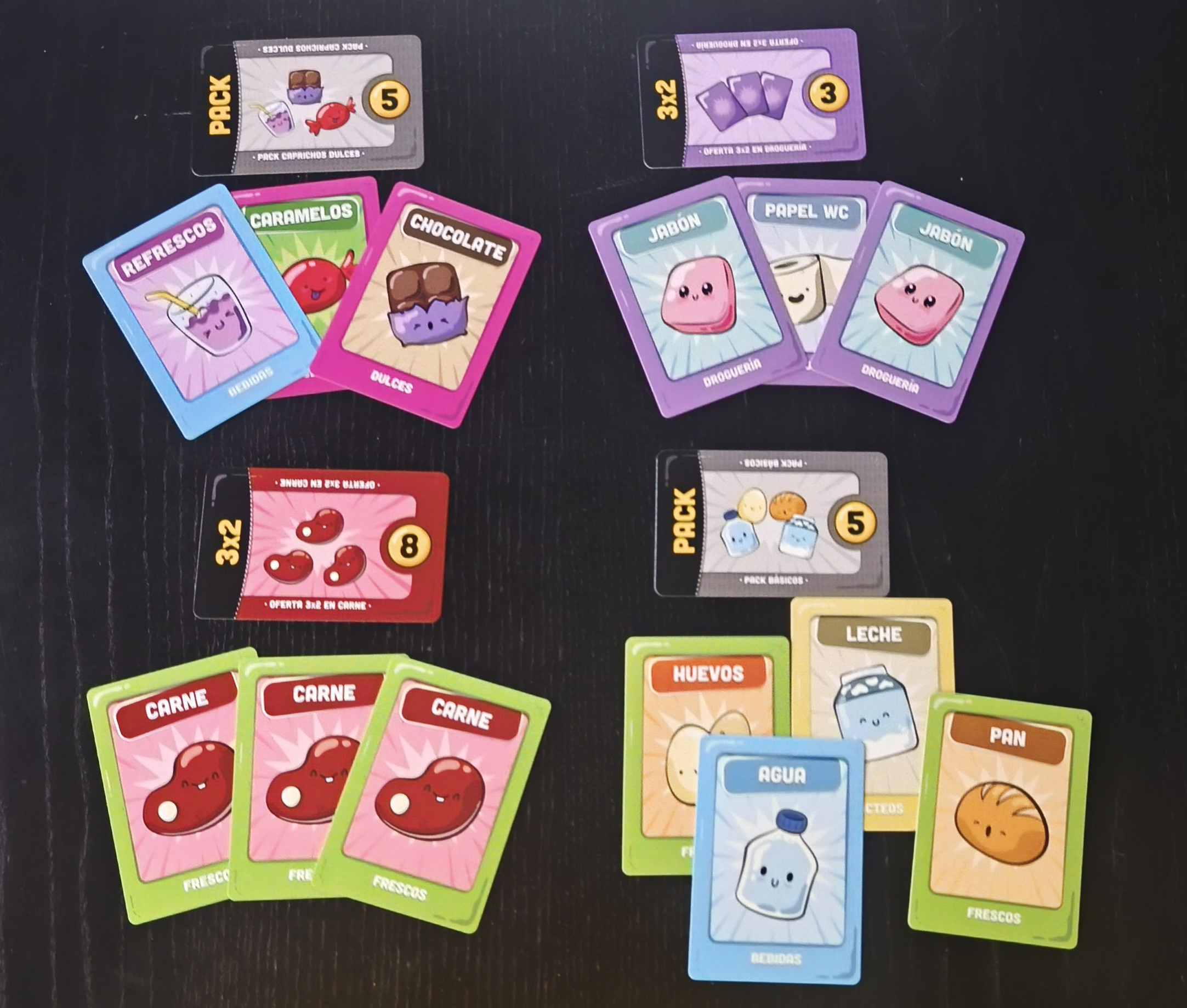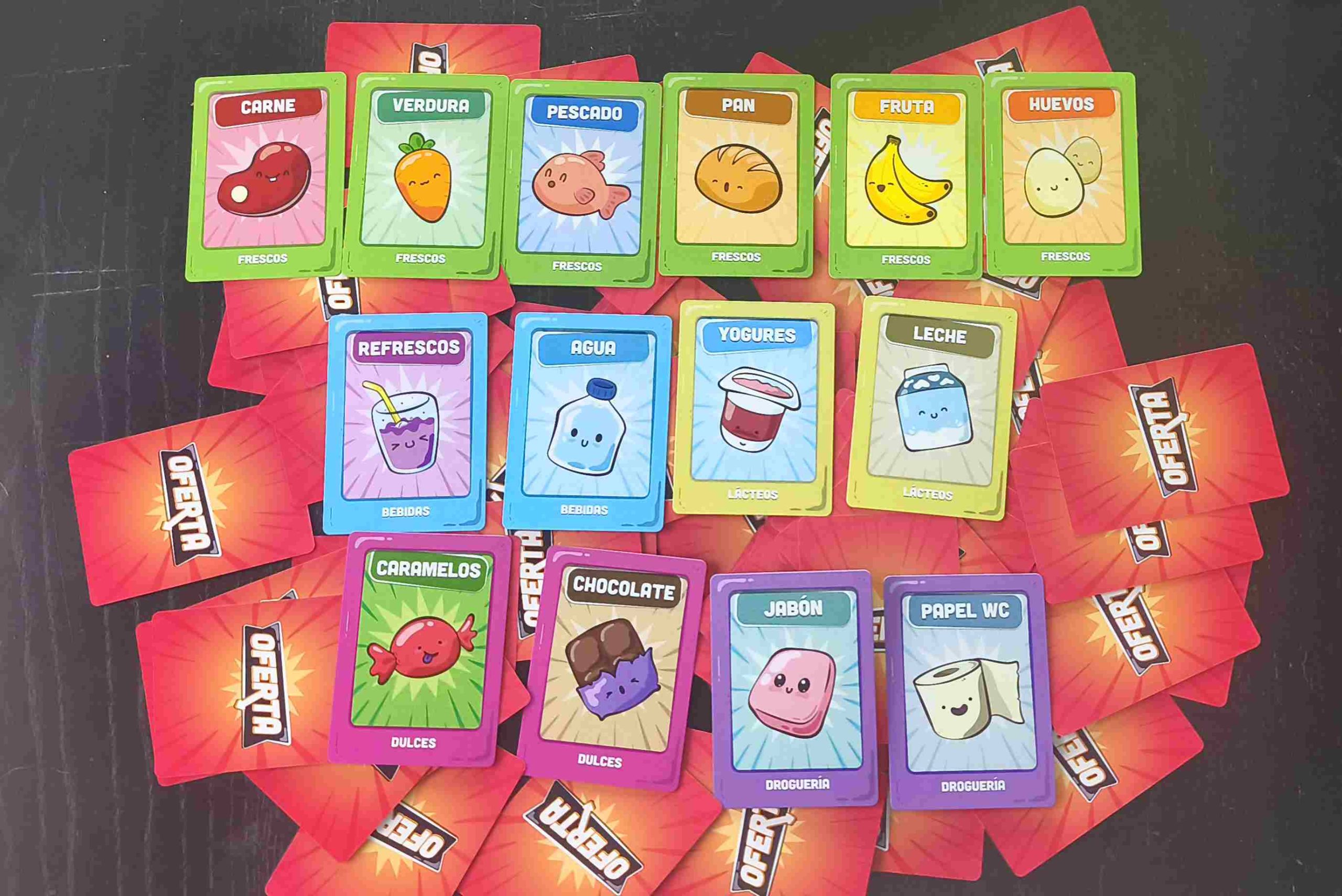 El juego incluye 80 cartas de producto en 5 categorías diferentes, 10 cartas especiales, y 52 cartas de oferta. Todas ellas ilustradas con una estética colorida y desenfadada. La caja es compacta y de muy buena calidad. Perfecta para llevarla a cualquier parte.