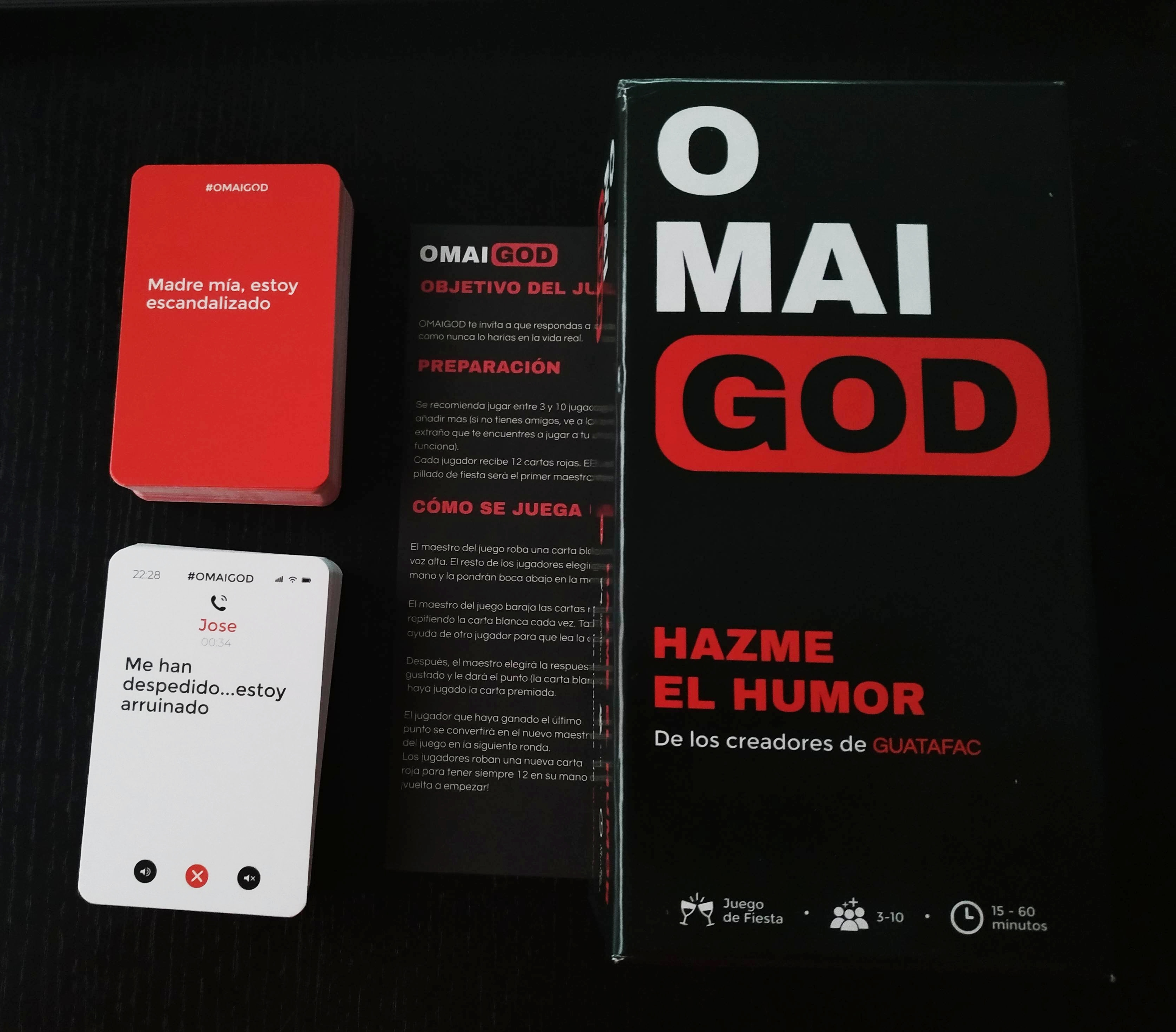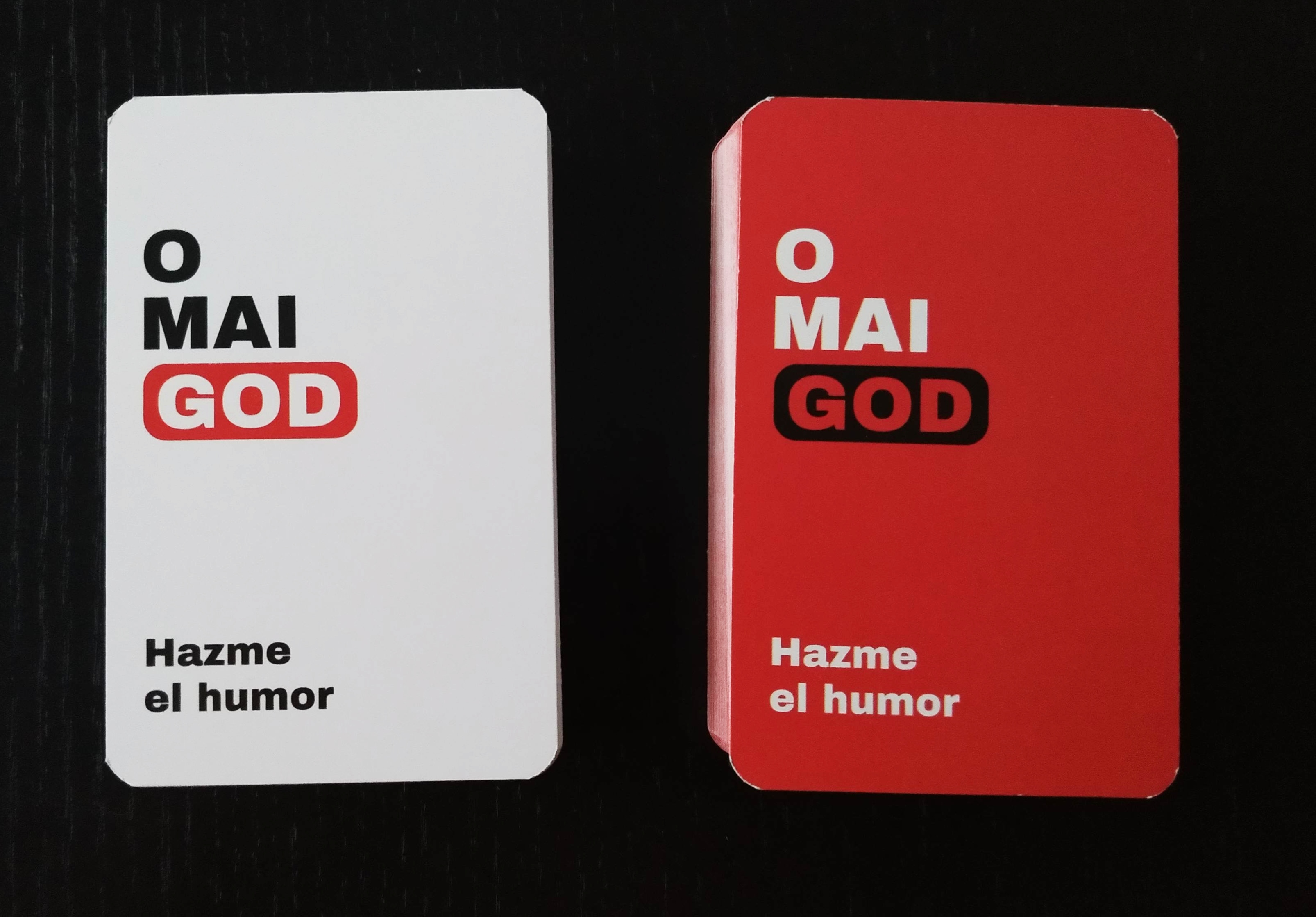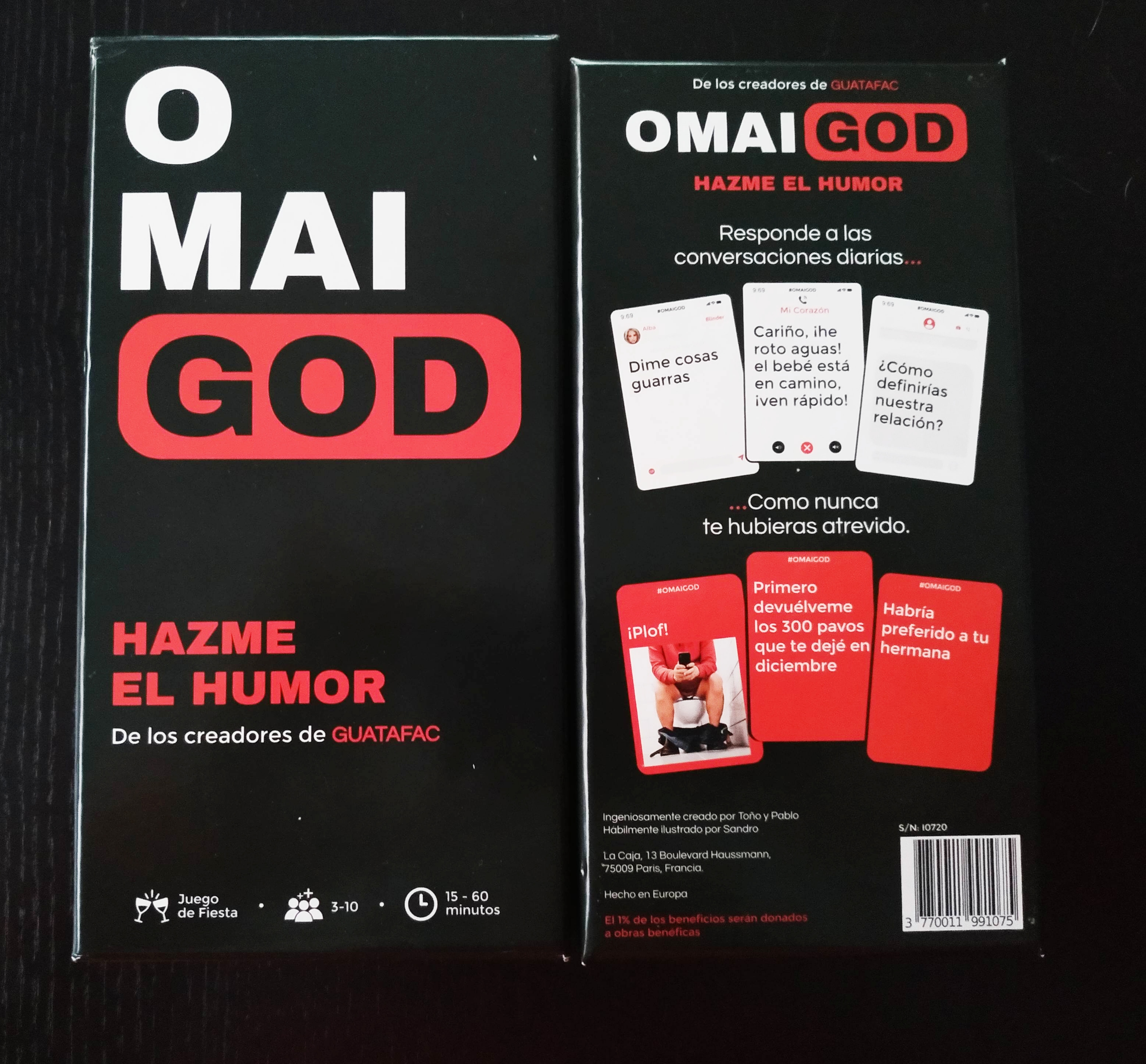 En una caja negra rectangular muy portable y con tonos blancos y rojos llamativos, nos hace llegar el mensaje de «hazme el humor» con solamente leer su título. La conocida expresión «Oh my god!» que se dice cuando algo te sorprende, ha sido transformada en un juego sencillo y divertido cuyo nombre sin duda ha sido elegido a la perfección: Ronda tras ronda nos sorprenderemos con las combinaciones y composiciones que cada uno de los jugadores crearán combinando la tarjeta central con una de su mano.