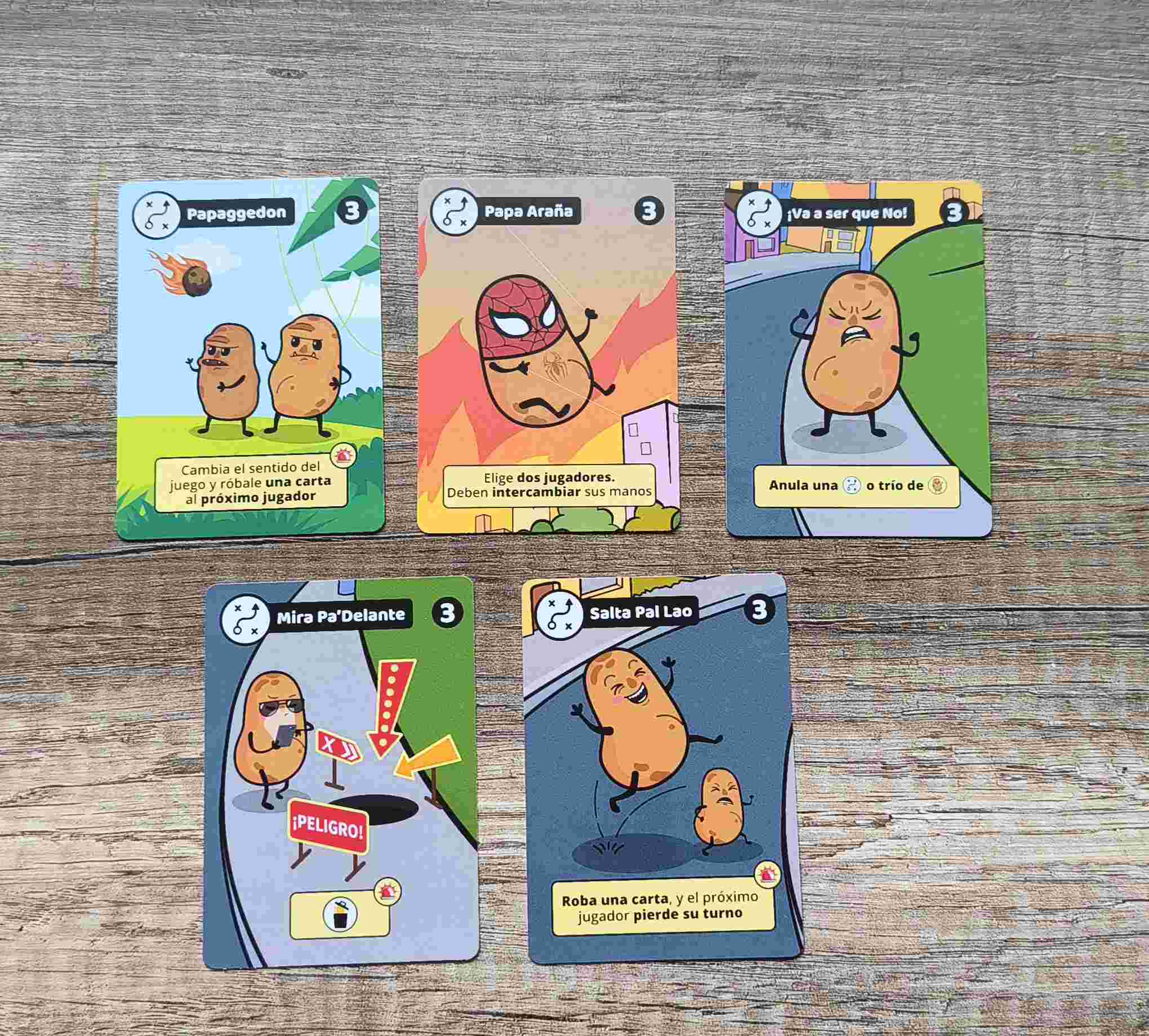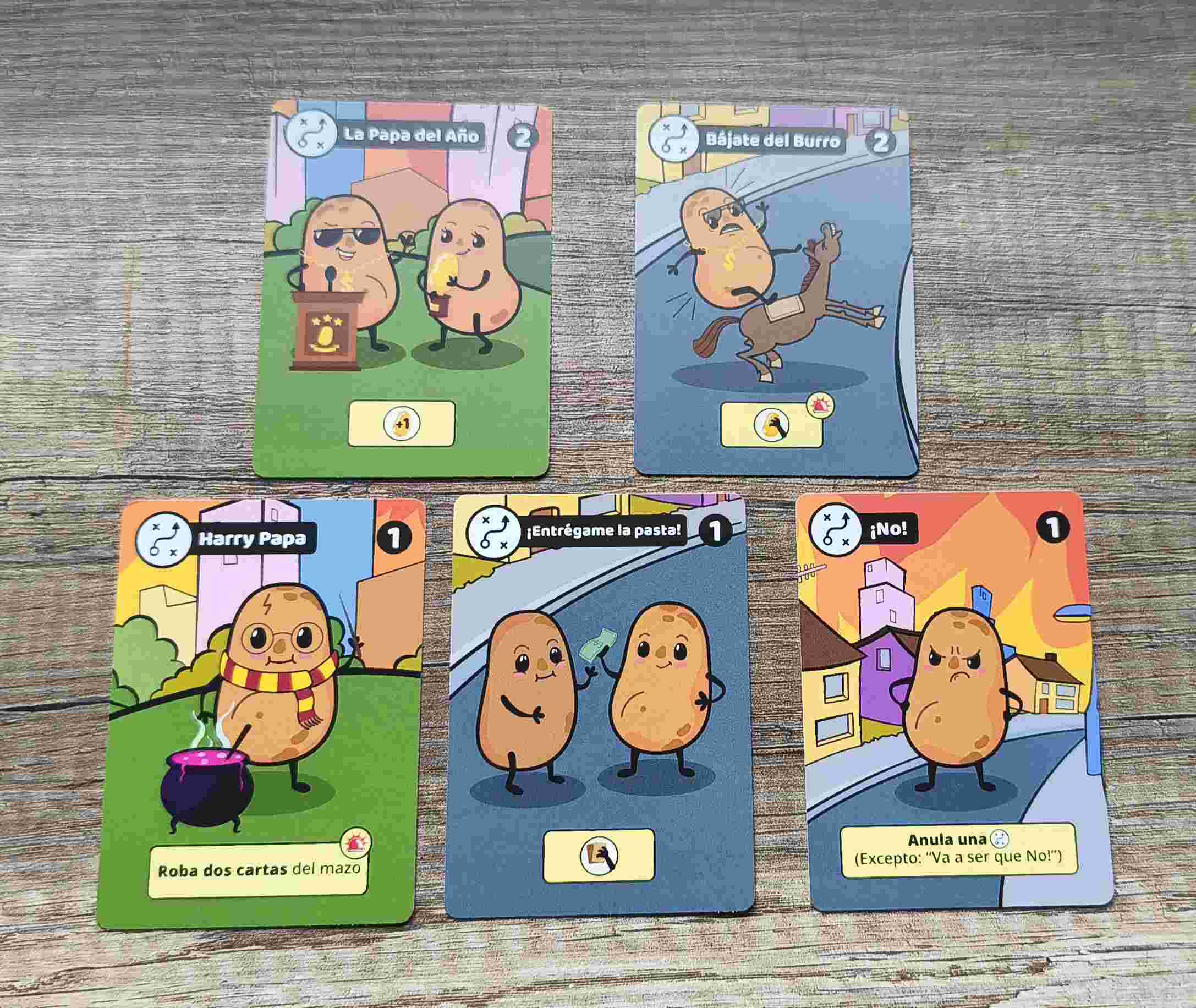 Nos ha gustado mucho que las cartas de papas de oro sean reversibles y cuando consigues más de una, puedas girar la carta que ya tienes para duplicarla.