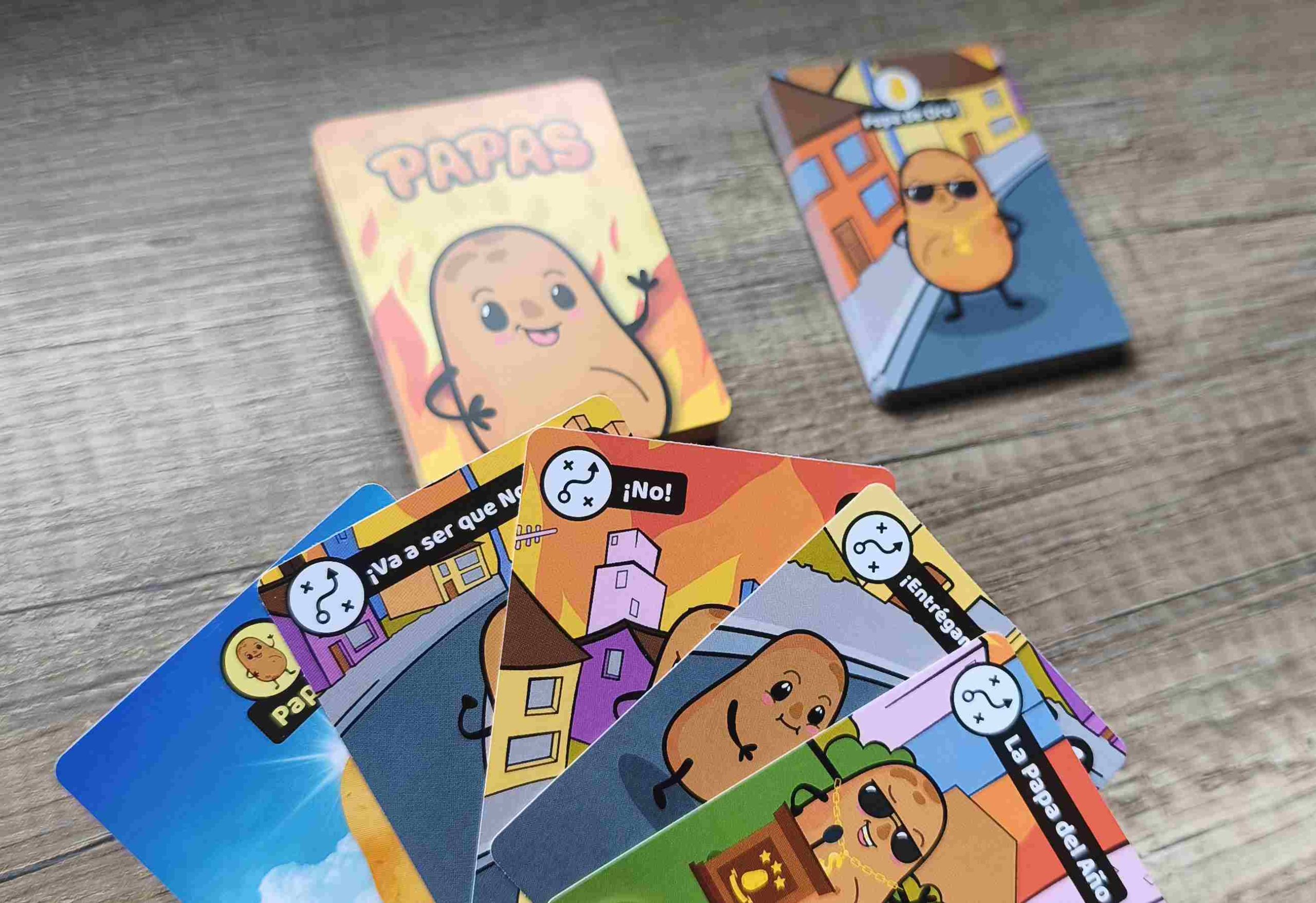 Papas es un entretenido juego de cartas para toda la familia donde tenemos que conseguir tríos para ganar las deseadas papas de oro. Pero eso sí, ¡Cuidado con enojar a los otros jugadores pues seguro que se toman una dura venganza!