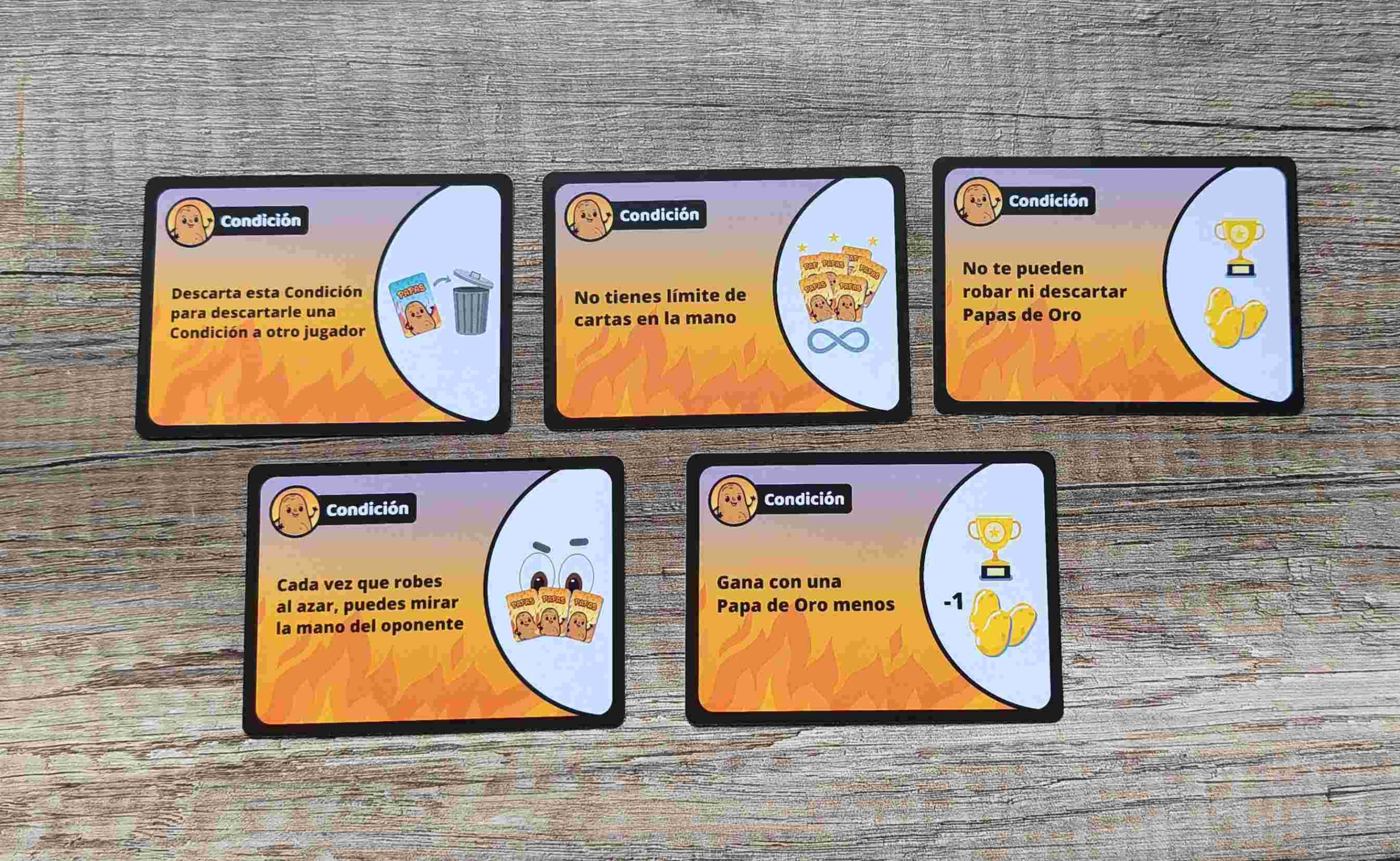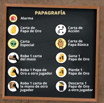 - 🧩 CONTENIDO: 16 papas, 12 papas duquesa, 5 papas fritas, 67 cartas de acción, 16 cartas de papas de oro, 3 comodines, 5 cartas de condición y 1 manual de instrucciones