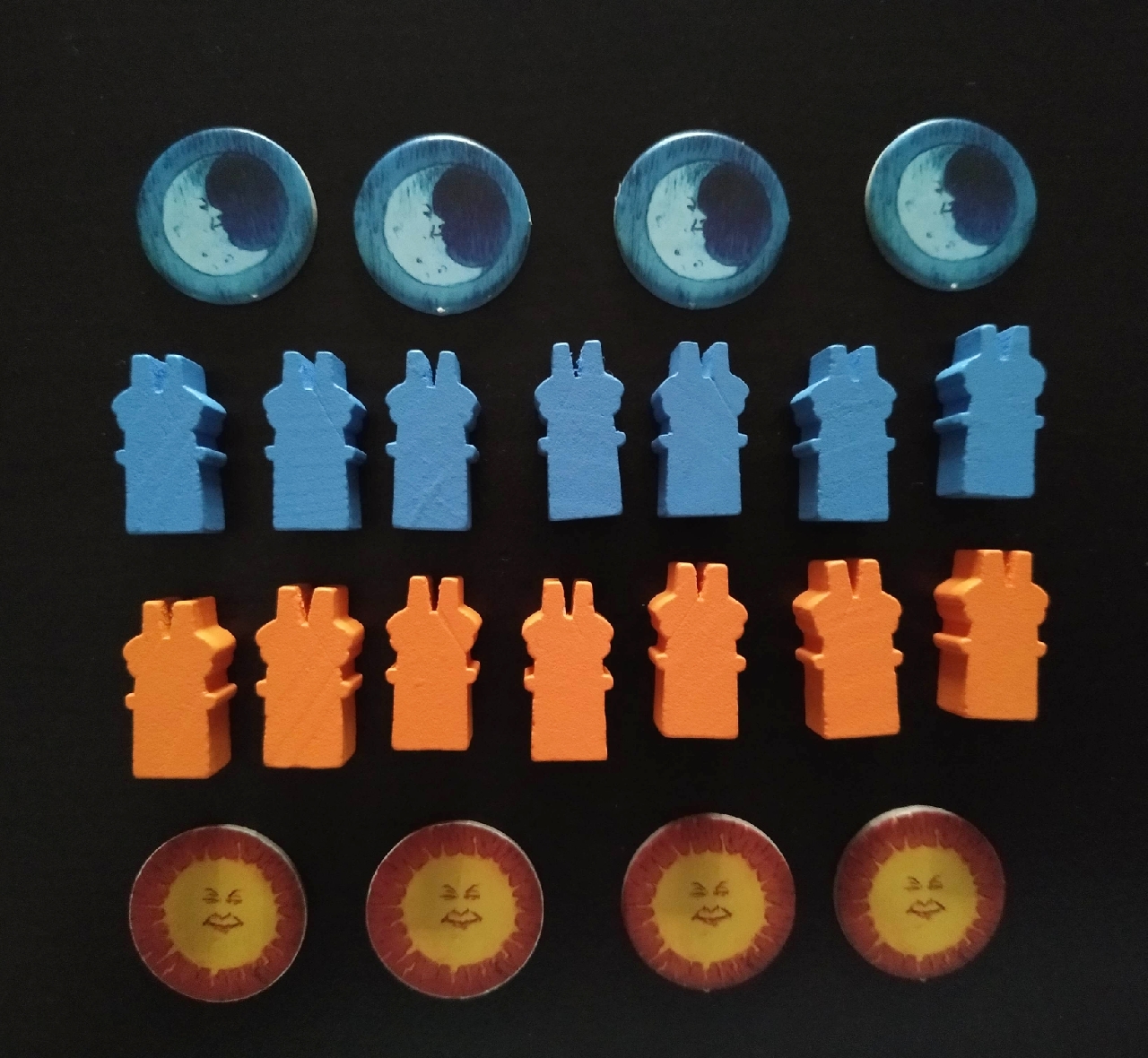 - Cada jugador va a utilizar un color (naranja o azul), por lo que cogerá las ocho losetas de adoquines de su color, sus 7 chimeneas y sus 4 indicadores de acción.