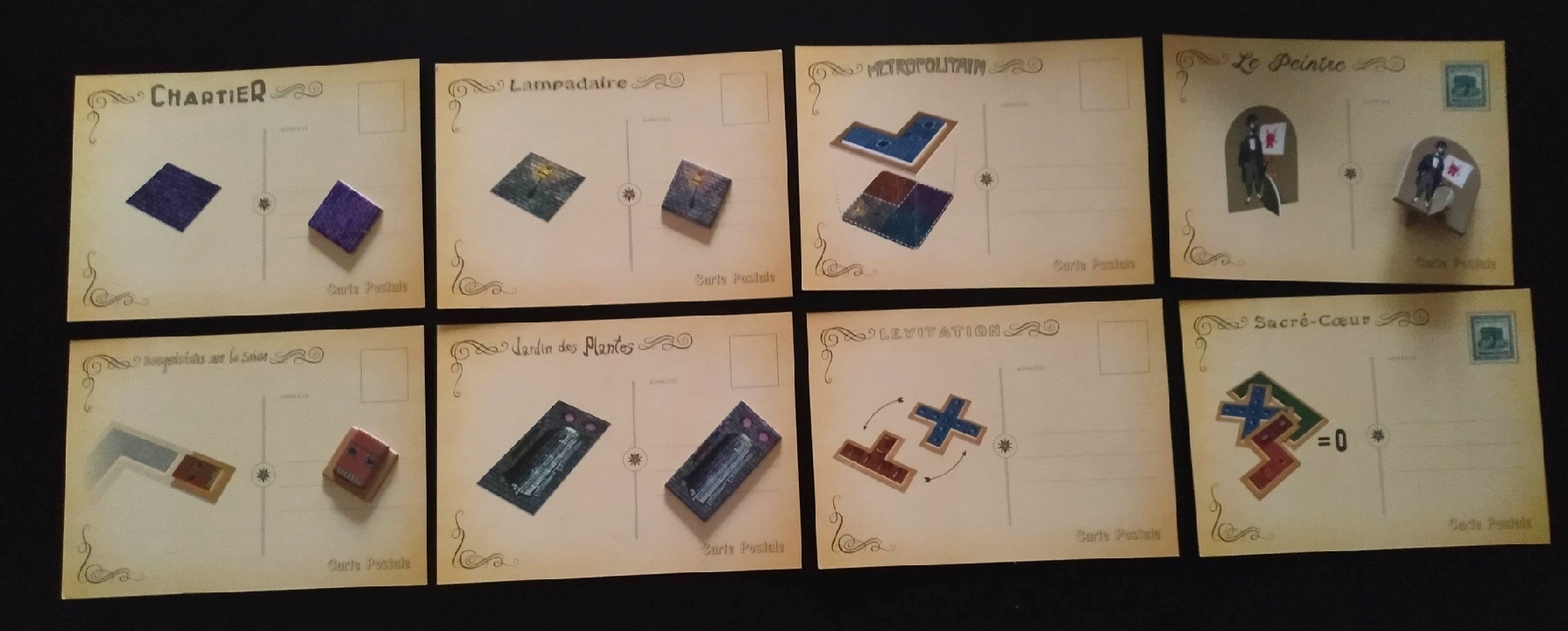 - Sacré Coeur: El jugador que posea esta postal no se restará puntos al final de la partida si le han quedado edificios pendientes.