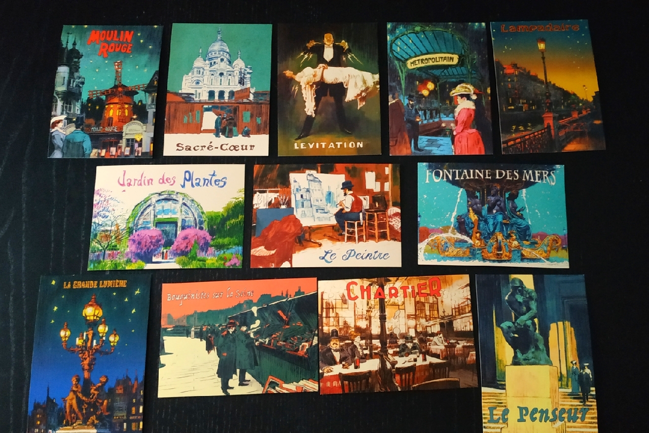 Para empezar, y sin duda, una de las cosas que más llama la atención a simple vista de París: La cité de la lumière, es su magnífico estilo artístico. La propia portada de la caja ya es un cuadro impresionista en sí mismo, pero es que las postales que se encuentran dentro, y que son elementos jugables, pasarían perfectamente por postales de verdad.