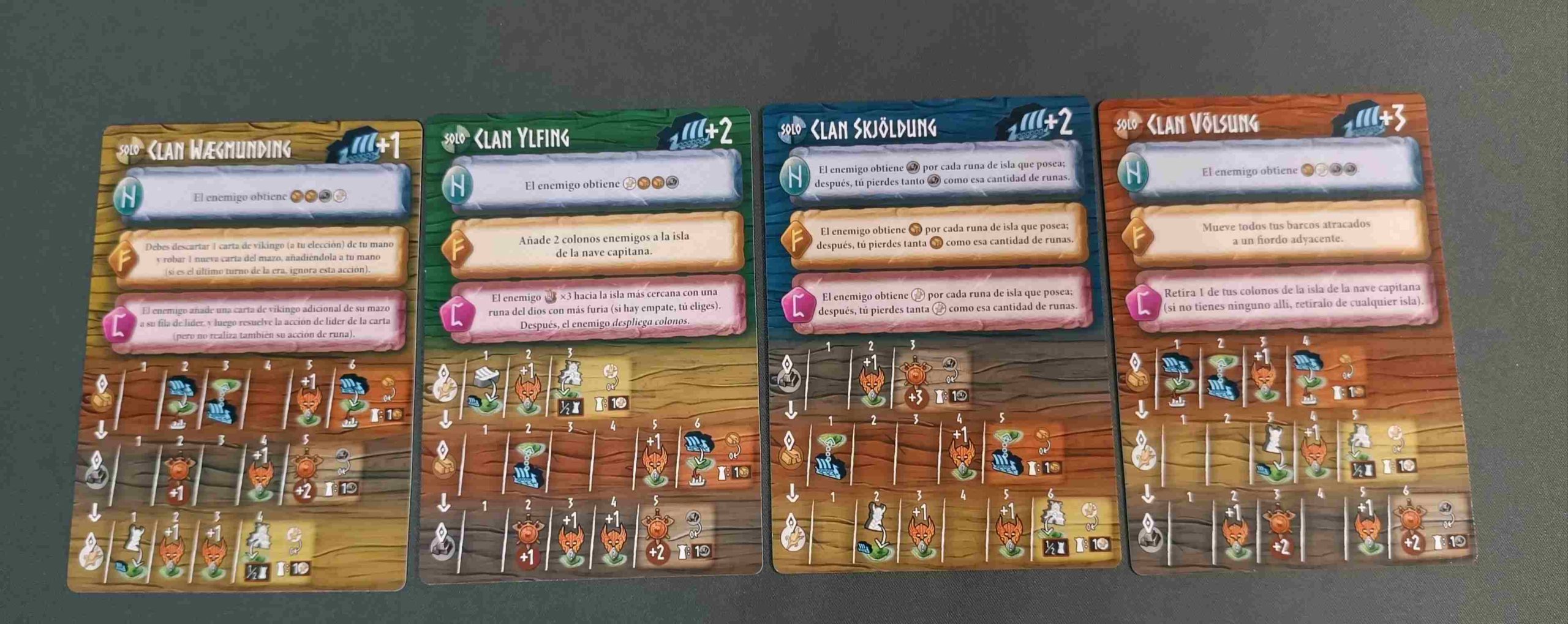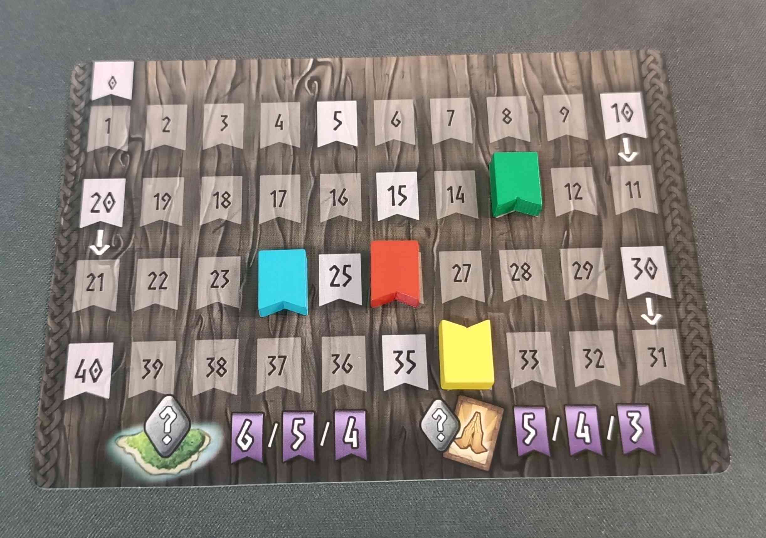 3. Fase de mantenimiento: Una vez que todos los jugadores han jugado todas sus cartas, la era finaliza. Si es la tercera era, acaba la partida y los jugadores pasarían al recuento final. En caso contrario, se descartan todas las cartas de vikingo jugadas y el cuervo desciende hasta la siguiente casilla de era y la ficha de jugador inicial pasa al jugador que tenga más runas de isla.