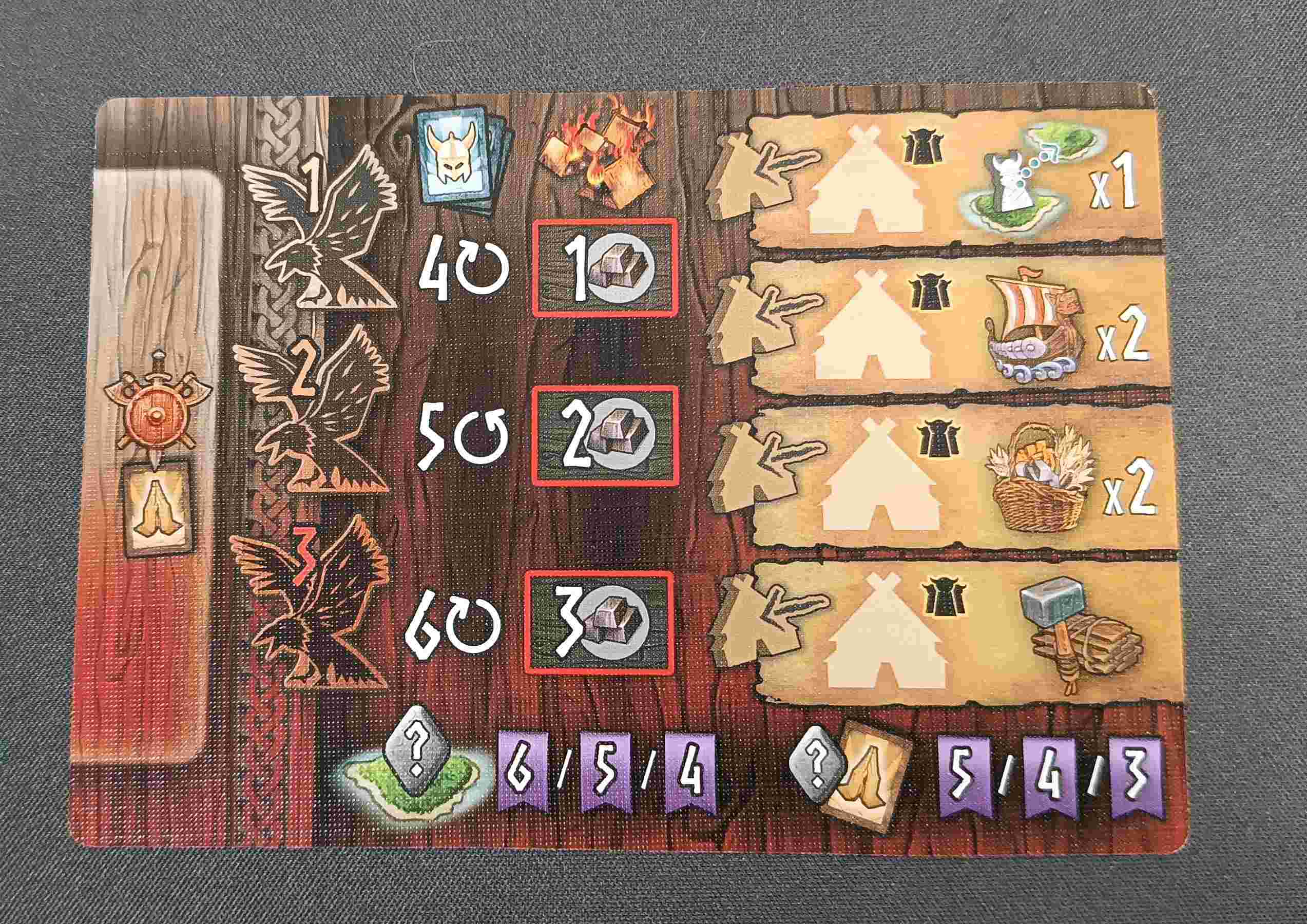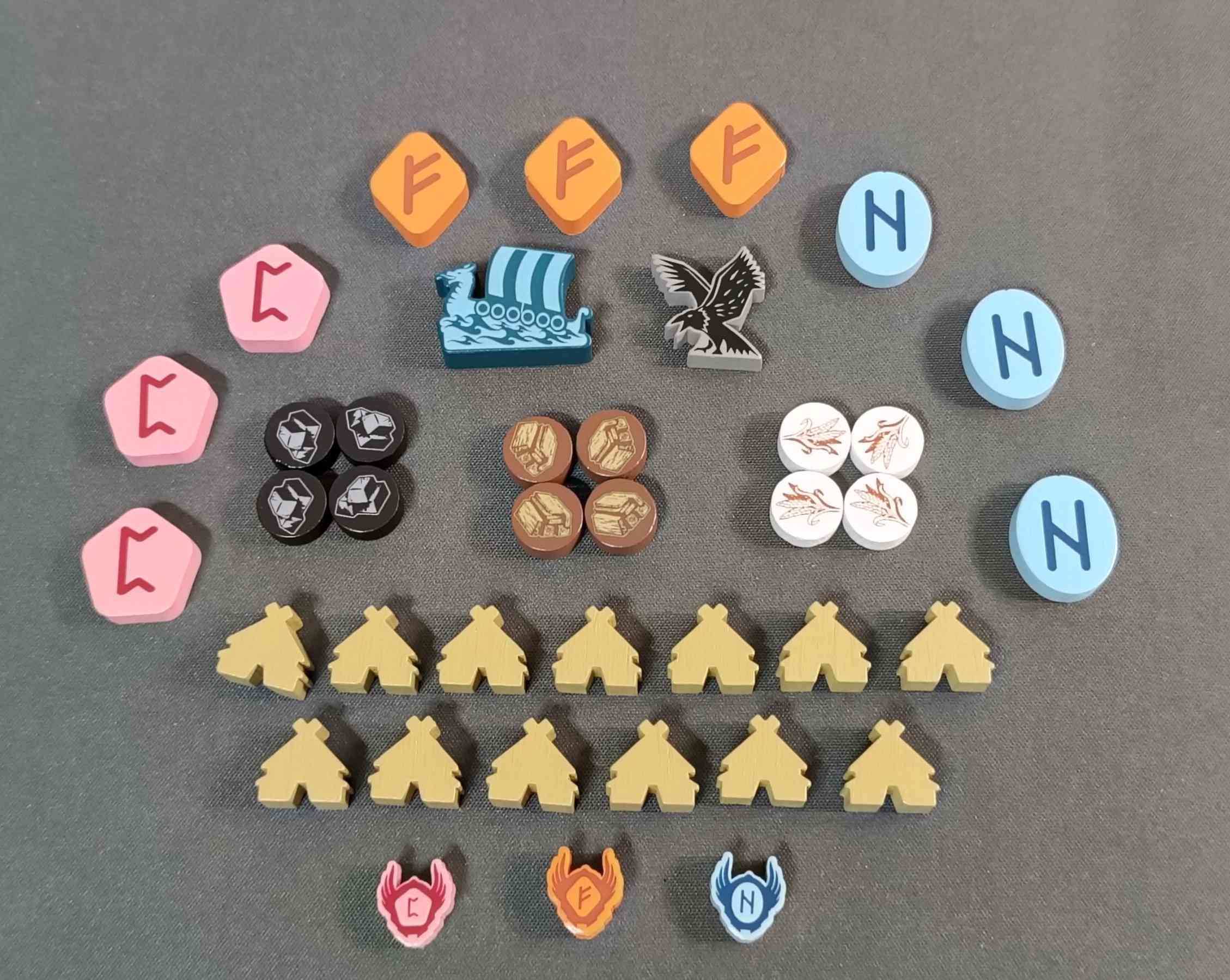 • 3 fichas de recurso diferente que colocarán en la casilla 2 del track de su tarjeta de clan.