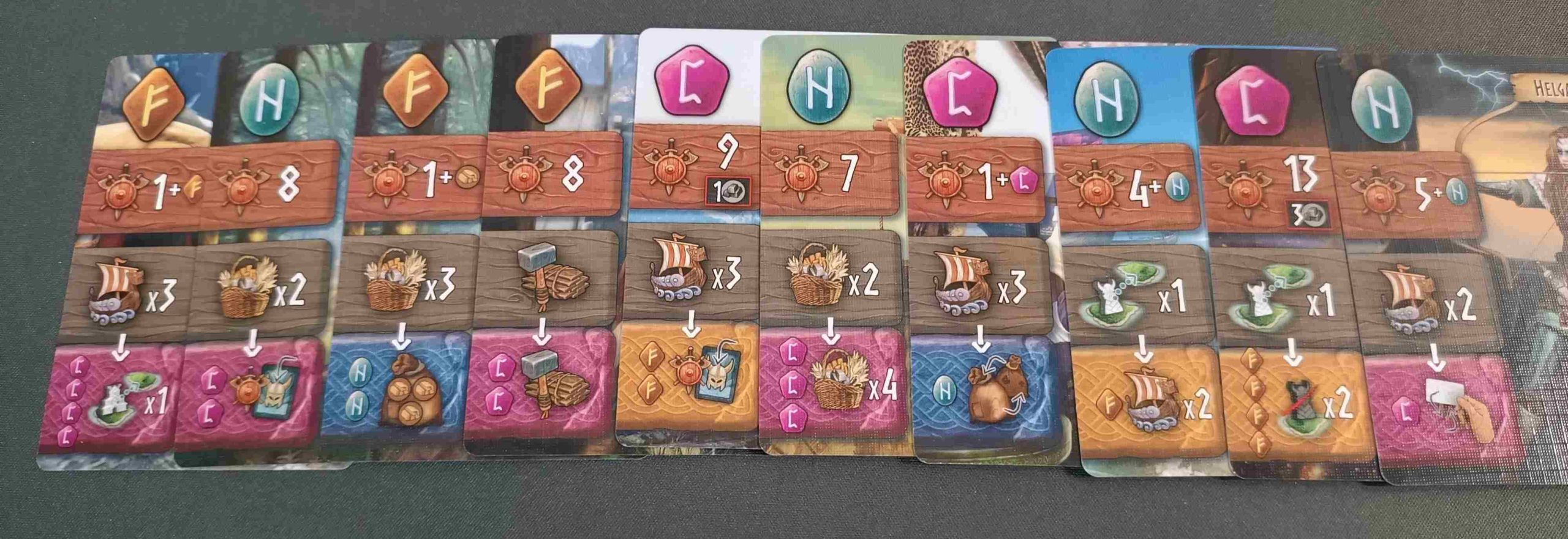 • El ganador obtiene la carta de favor obteniendo así sus dos beneficios. Uno de ellos es inmediato en forma de los recursos que vienen en la propia carta y, el segundo, en forma de runas pasivas que puntuarán a final de partida.