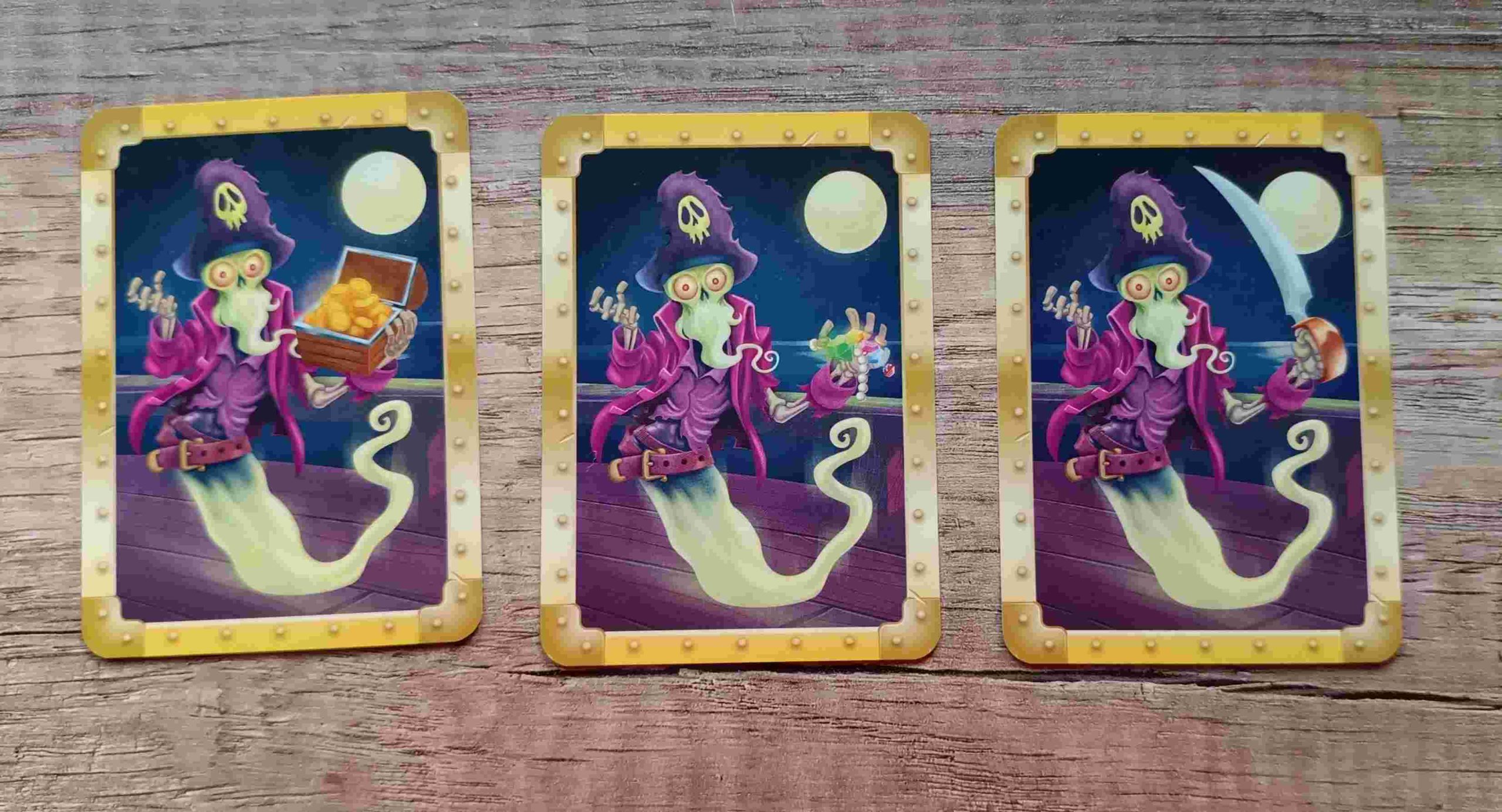 En todos los barcos siempre tiene que haber un pirata fantasma que aparece de vez en cuando y, en este juego, cuando aparezca, lo que deberemos hacer es intentar ser los más rápidos en coger el botín pirata para después coger la carta de tesoro que pedía ese fantasma, si no la tenemos.