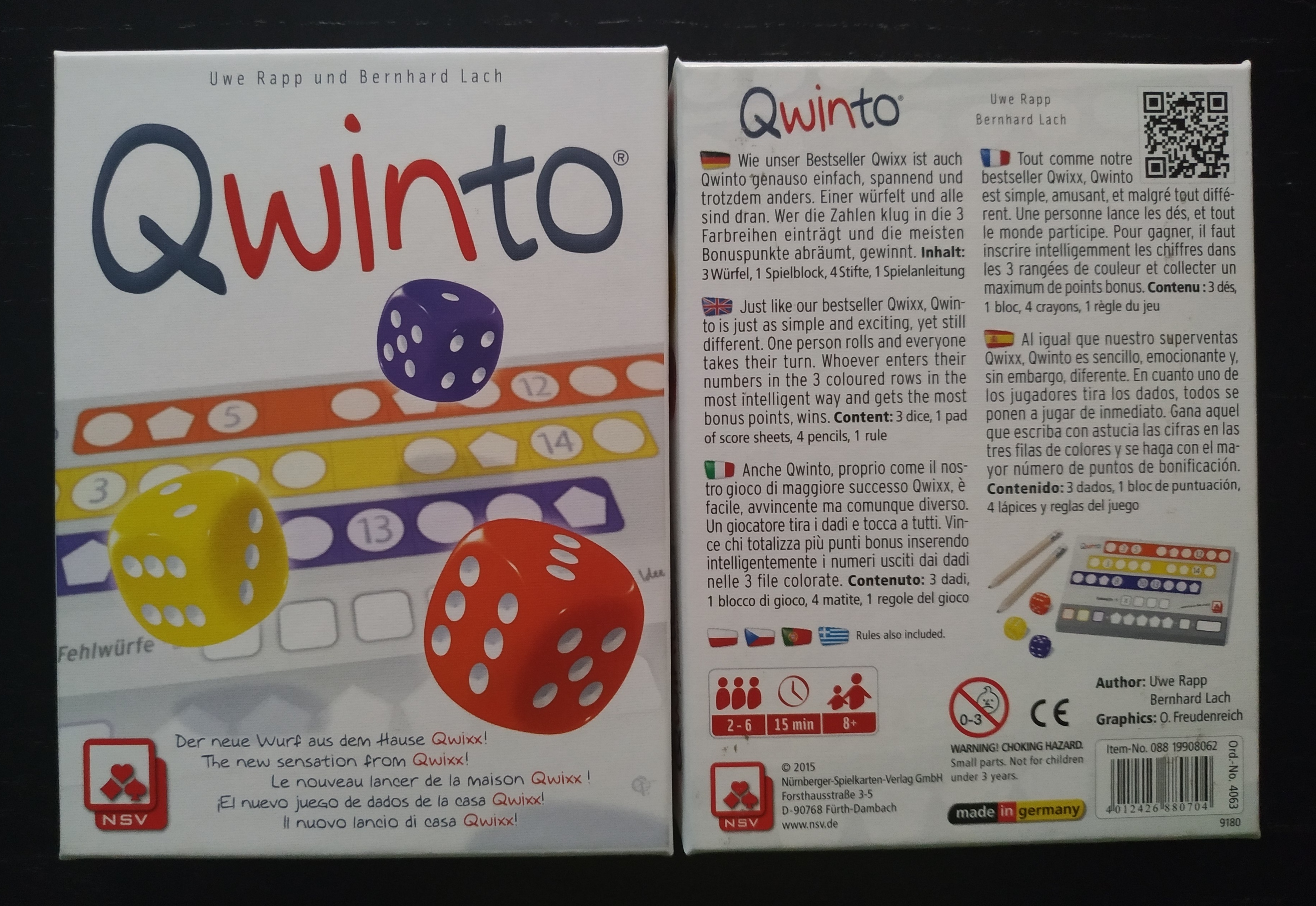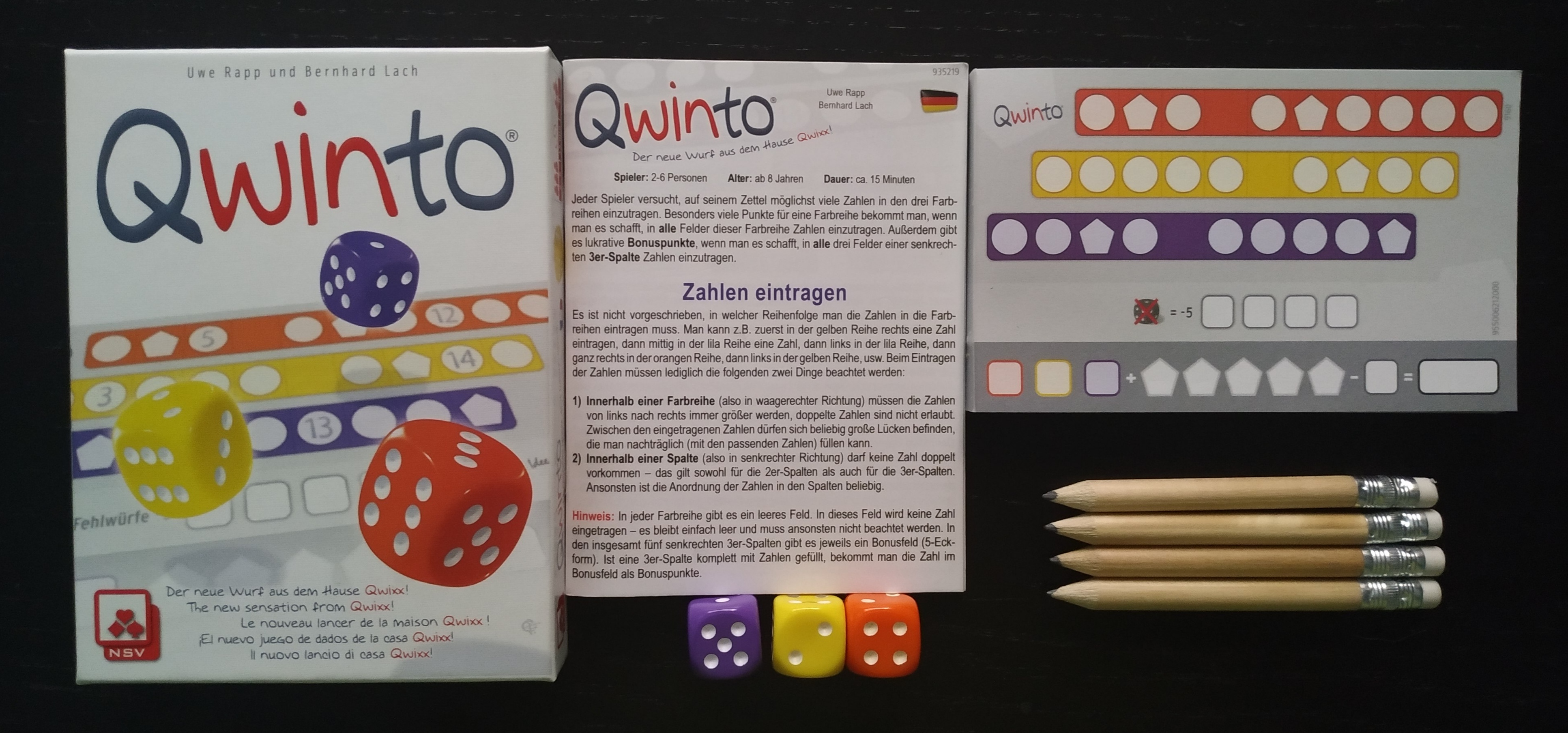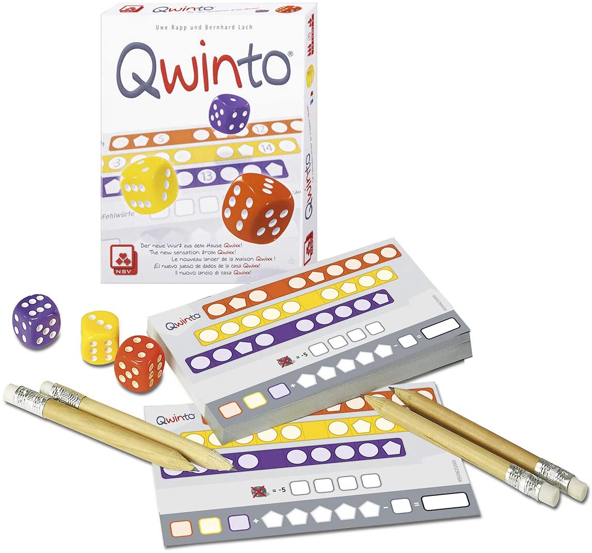 Qwinto es sencillo, emocionante y diferente. En cuanto uno de los jugadores tiran los dados, todos se ponen a jugar de inmediato. Gana aquel que escriba con astucia las cifras en las tres filas de colores y se haga con el mayor número de puntos de bonificación.