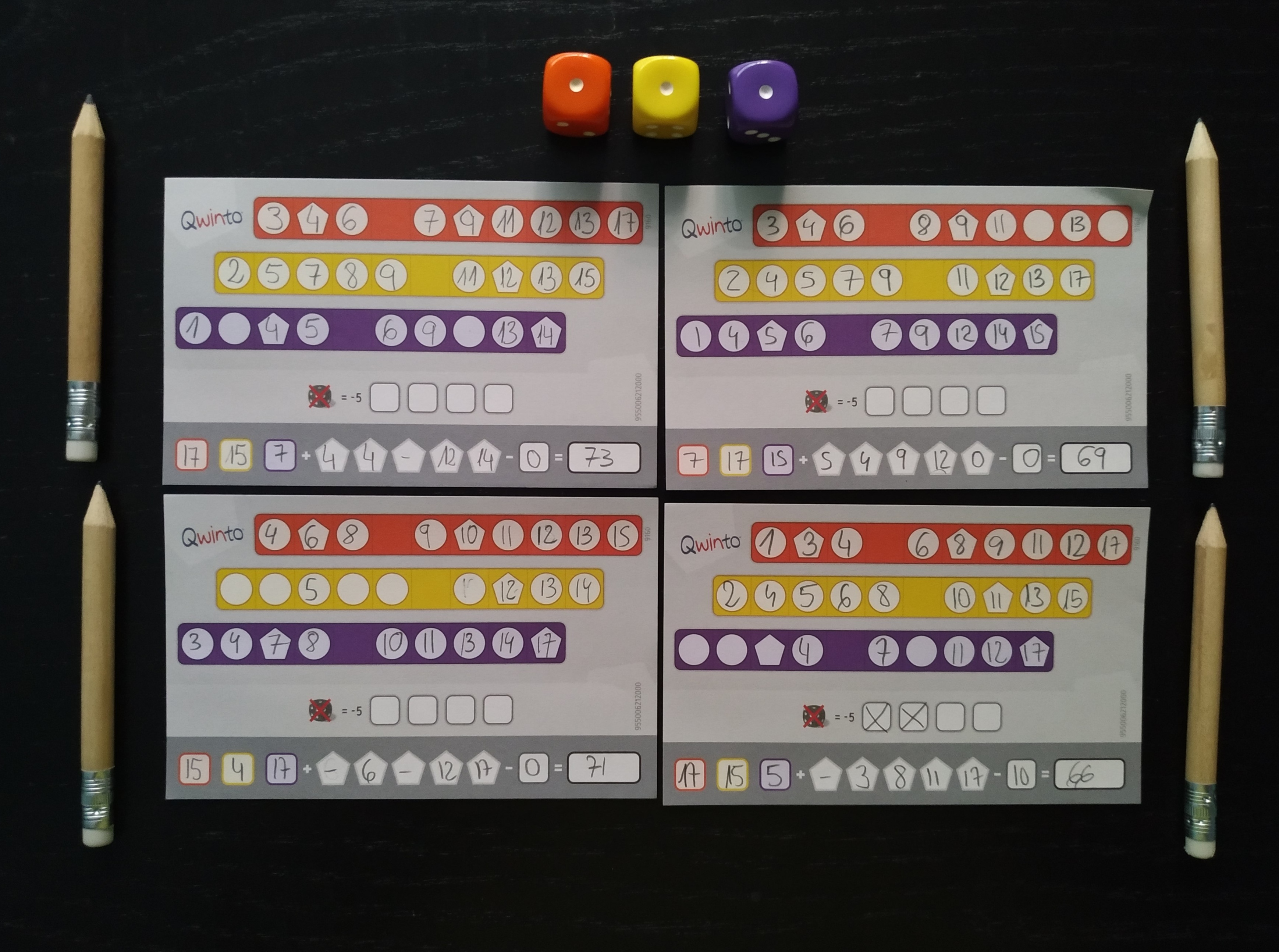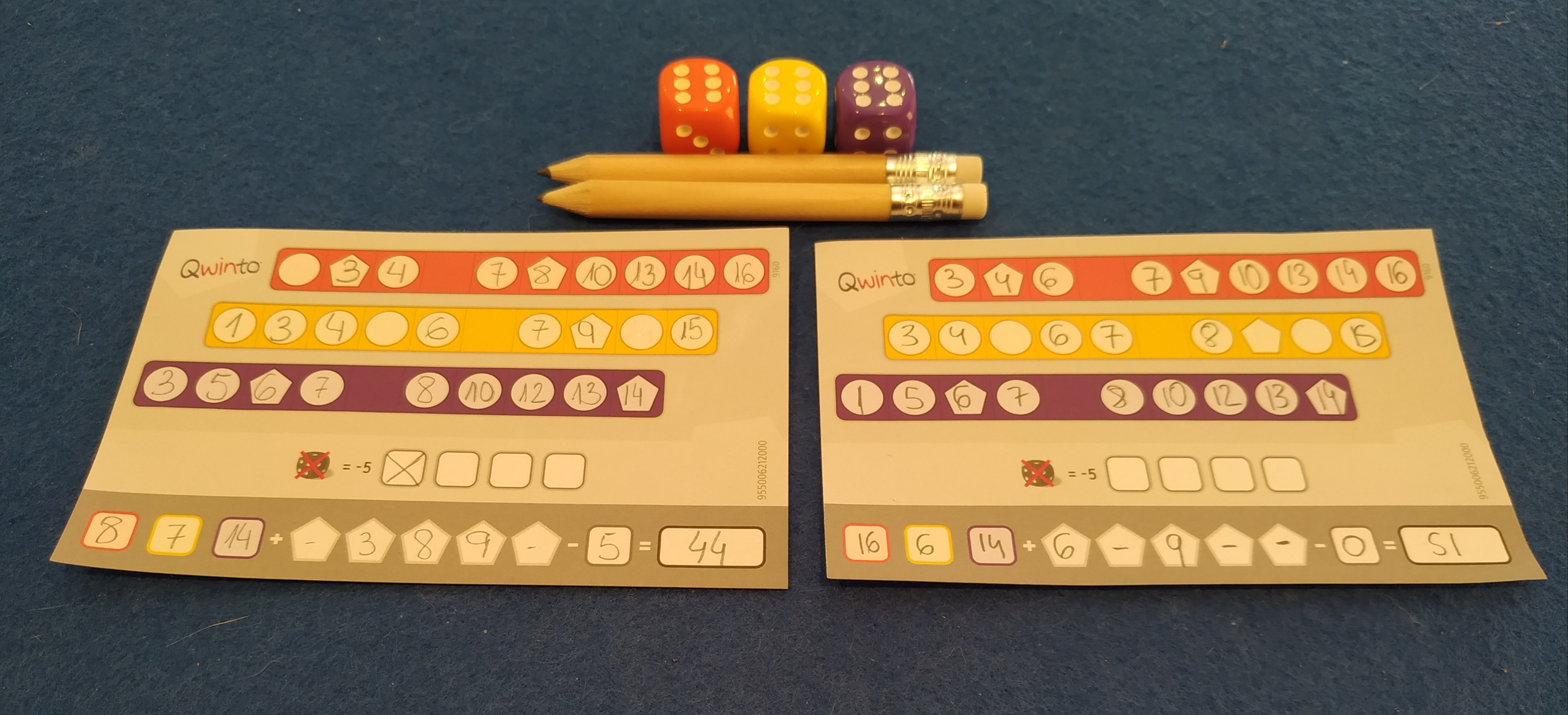 Por otro lado, Qwinto es un juego que escala tremendamente bien. Va de dos a seis jugadores y en cualquiera de estos números funciona perfectamente. Es más, realmente podrían jugar todos los que quisieran mientras tengan una hoja de puntuación disponible. No existe interacción entre los jugadores, los turnos son muy cortos, sencillos, rápidos y simultáneos. Cuando el jugador activo lanza los dados, éste está obligado a anotar dicha puntuación sino quiere tener un tiro fallido, pero el resto de jugadores a la vez pueden anotarlo si quieren. Obviamente, lo único que hay que tener en cuenta es que cuantos más seamos, menos veces seremos el jugador activo y por tanto menos veces elegiremos nosotros cuántos y qué dados queremos lanzar. Es exactamente esa la parte diferenciadora. Si solo jugamos dos personas, tomaremos el control de esa decisión muchas más veces que si somos seis (o más) en las que tendremos que adaptarnos a las decisiones de los demás para ver si su resultado nos encaja.