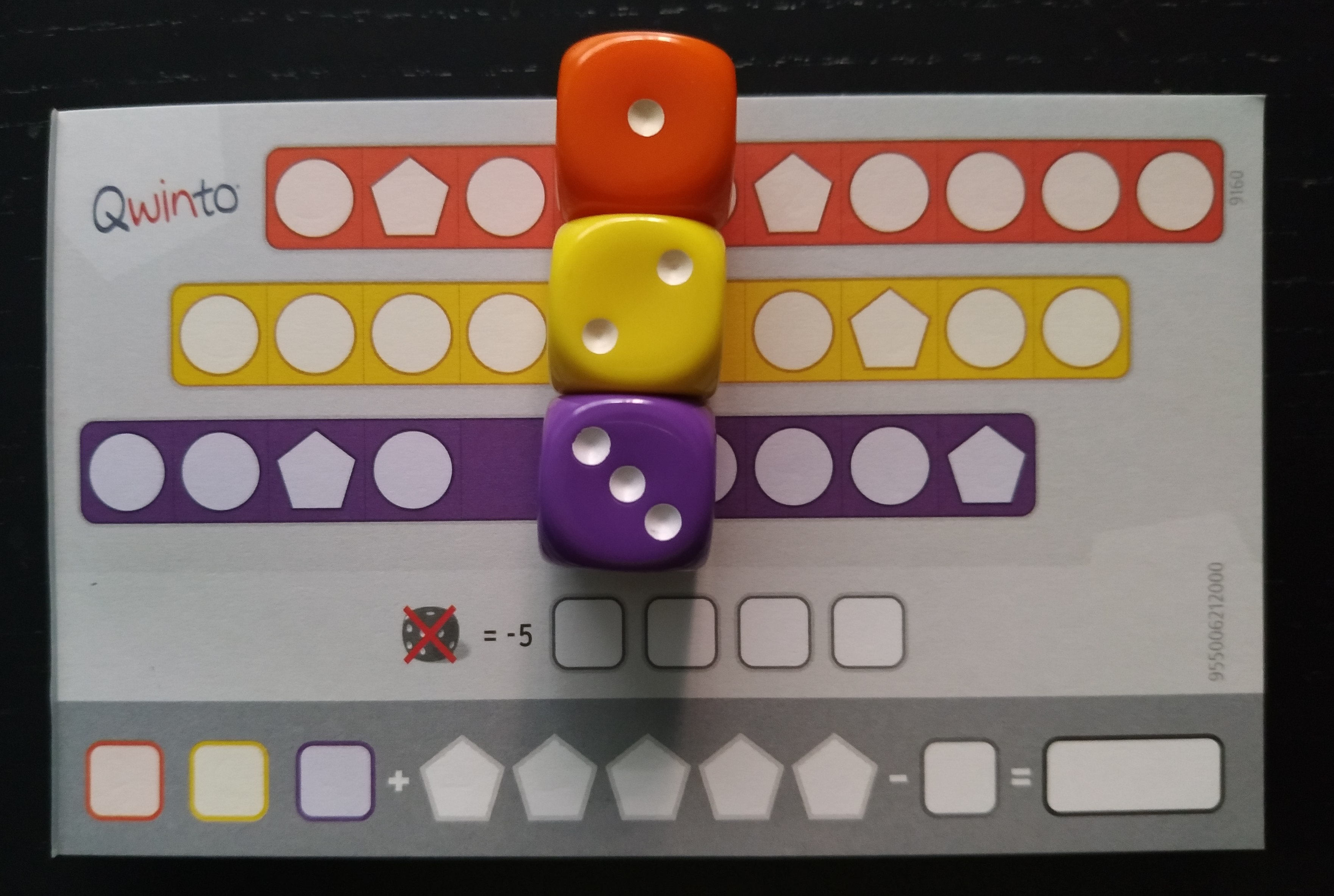 En Qwinto cada jugador debe obtener la mayor puntuación posible. Para ello, debe anotar tantos números como pueda en las tres líneas de colores de su hoja de jugador respetando unas simples reglas. Si consigue anotar números en todas las casillas de una línea, conseguirá muchos más puntos por dicha línea. Además, obtendrá puntos extra completando las tres casillas de cualquiera de las cinco columnas verticales que contienen un pentágono.