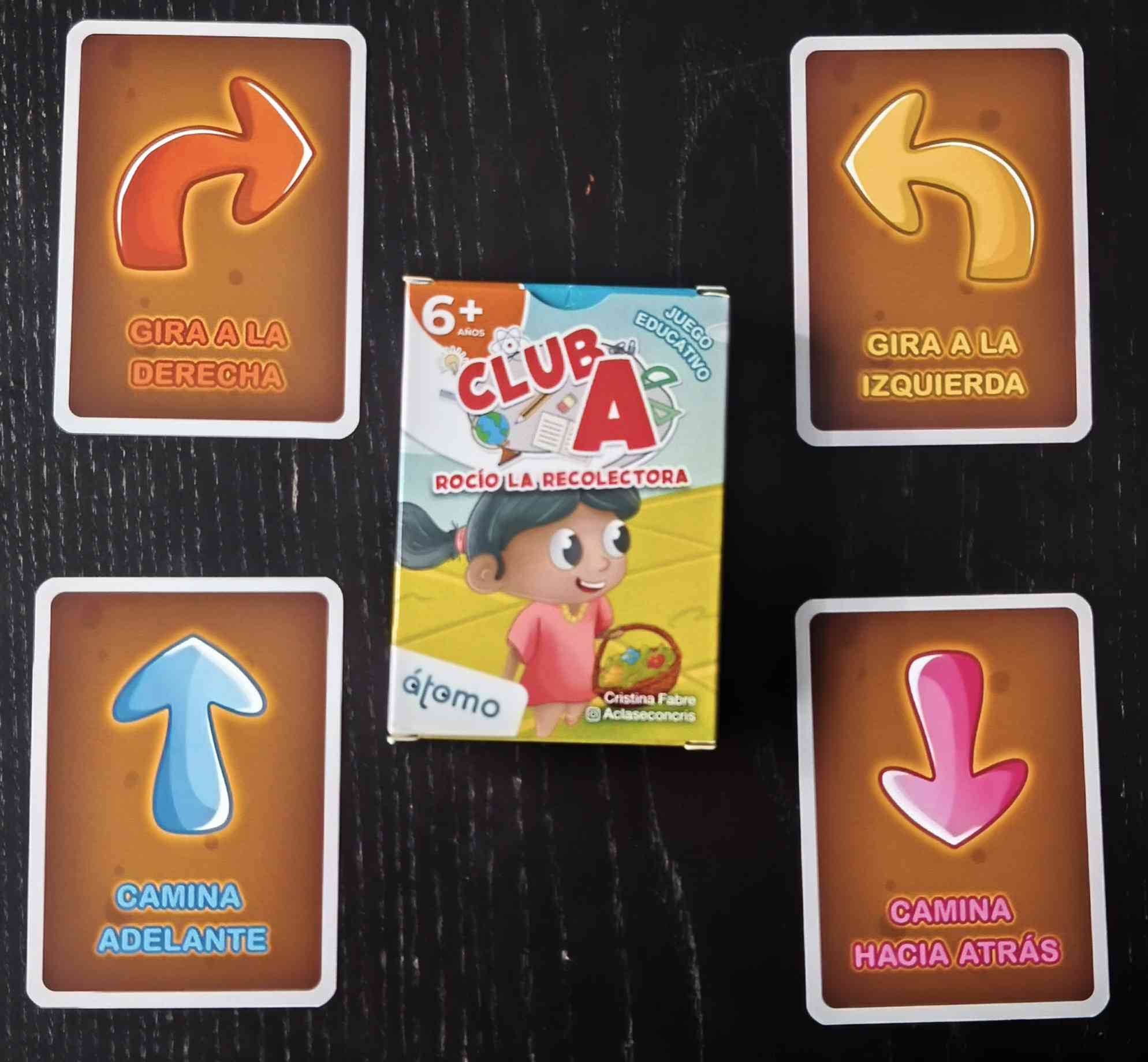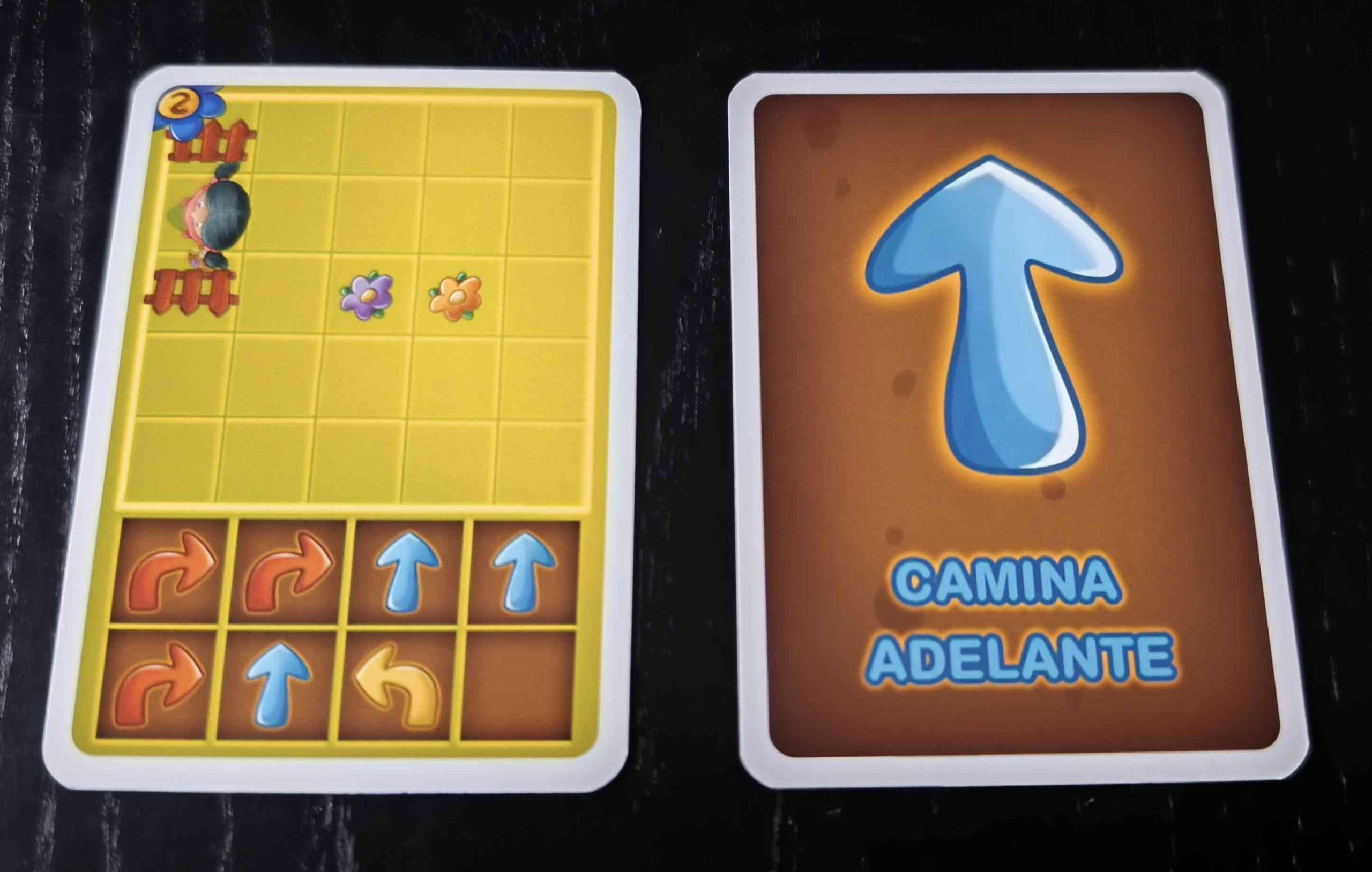 Cada jugador dispone de cuatro cartas de dirección: girar a la izquierda, girar a la derecha, ir hacia delante o ir hacia atrás. Con estas cartas, los jugadores debemos completar la secuencia de movimientos que falta, indicando a Rocío cómo moverse por el mapa para que logre recoger todas las flores.