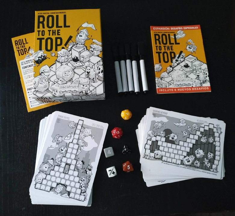 Roll to the top y su expansión son unos roll and write con diferentes láminas borrables que nos proponen el desafío de ir ascendiendo por nuestro escenario completando los huecos con los resultados de los diferentes dados que lanzamos. Nuestro objetivo será siempre conseguir ser el primero en completar entera la pizarra.