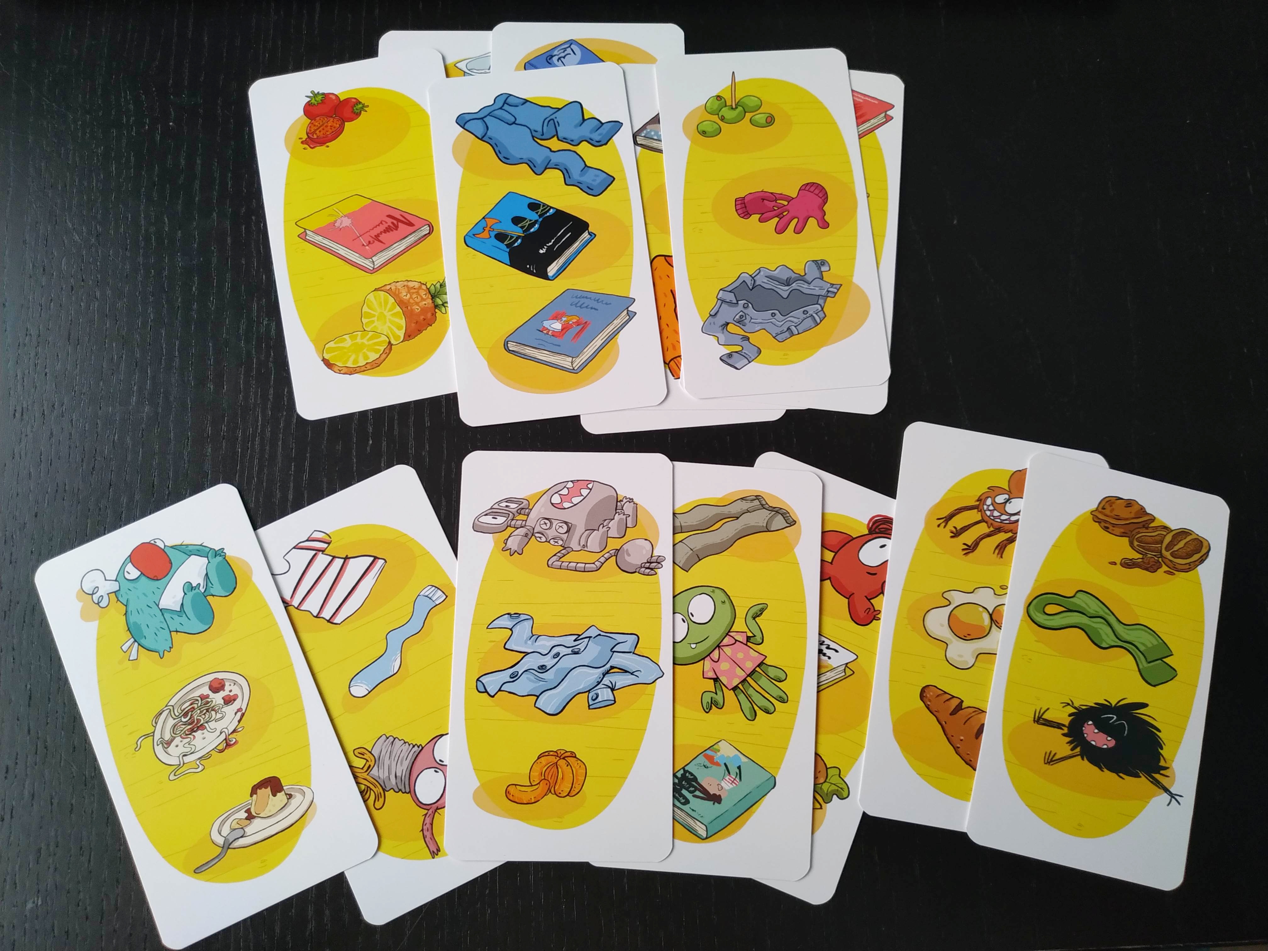 Como hemos visto, pueden ser libros, ropa o comida lo que digamos para batirnos los unos a los otros pero no monstruos, aunque estos también aparezcan en las cartas de fondo amarillo. ¿Por qué? Pues porque ellos serán los que nos den puntos en el recuento final cuando hayamos terminado las cartas utilizadas y por lo tanto, deberemos intentar conseguirlos en las diferentes bazas que juguemos.