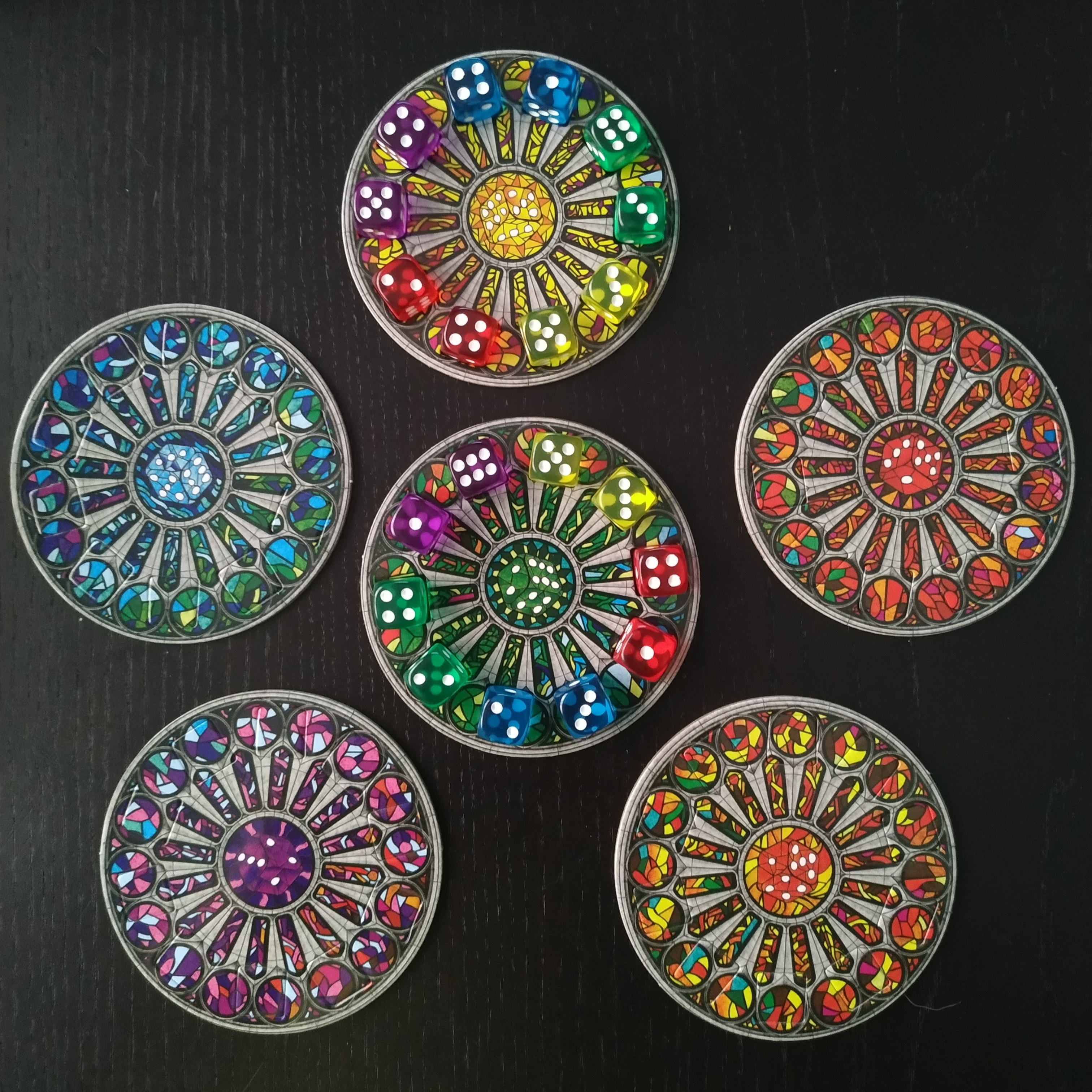 Lo primero que debemos hacer es dar a cada jugador 10 dados (2 de cada color) que deberán lanzar y colocar, con los resultados que hayan salido, en sus ruletas de dados privados. Esas ruletas conjuntan en color con su ventana de vidriera.