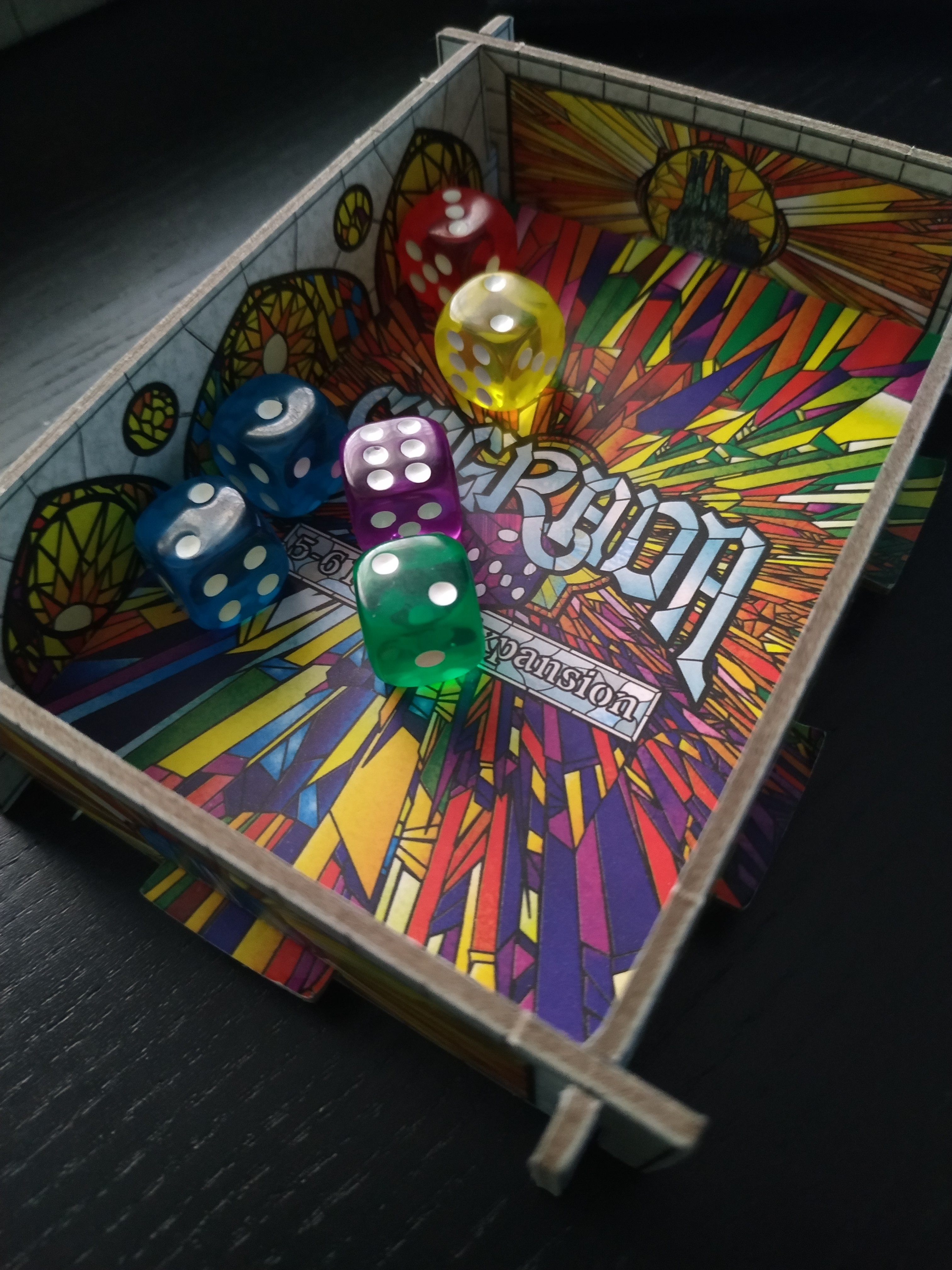 Sus componentes, de la misma buena calidad que los del juego base, nos llaman la atención nada más levantamos la tapa: unos vitrales de colores nuevos, muchos dados nuevos, cristales de donativos adicionales, cartas que añaden variedad y dos elementos que brillan por su innovación: las ruletas de dados privados y una bandeja para dados decorada en la misma línea que el juego.