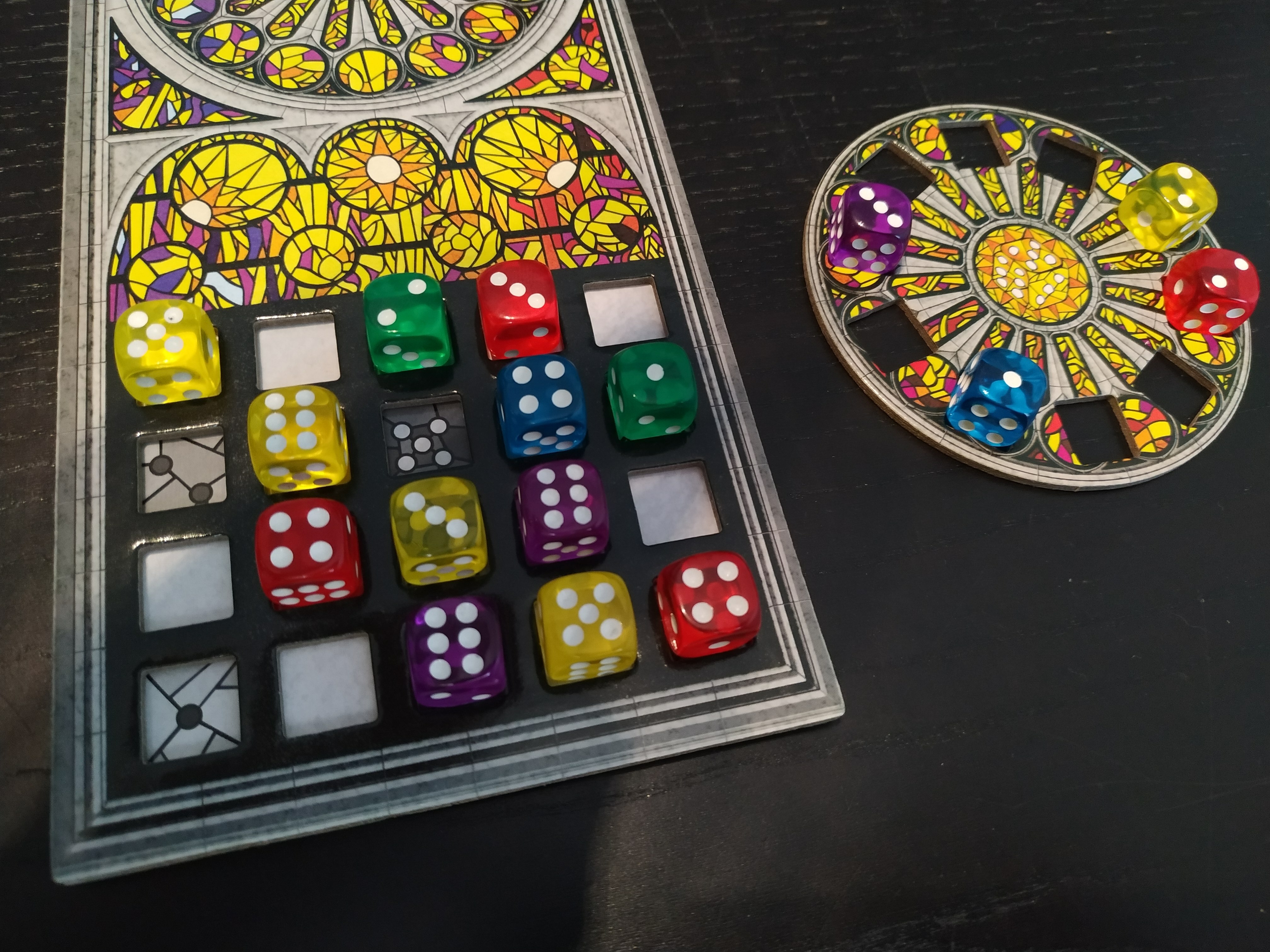 Al tener los dados privados ya lanzados y a la vista, sabemos los resultados y colores que tendremos disponibles para utilizar en cualquiera de nuestros turnos y que nadie podrá quitarnos. Éste nuevo modo de juego modifica el habitual del draf de dados al que estábamos acostumbrados y mejora la aleatoriedad que nos daba el sacar los dados de la bolsa sin mirar y lanzarlos, teniendo que coger en el momento lo que había salido y pudiendo suceder que uno de nuestros oponentes cogiera el dado que queríamos para nuestro vitral, cosa que ahora se ha reducido.