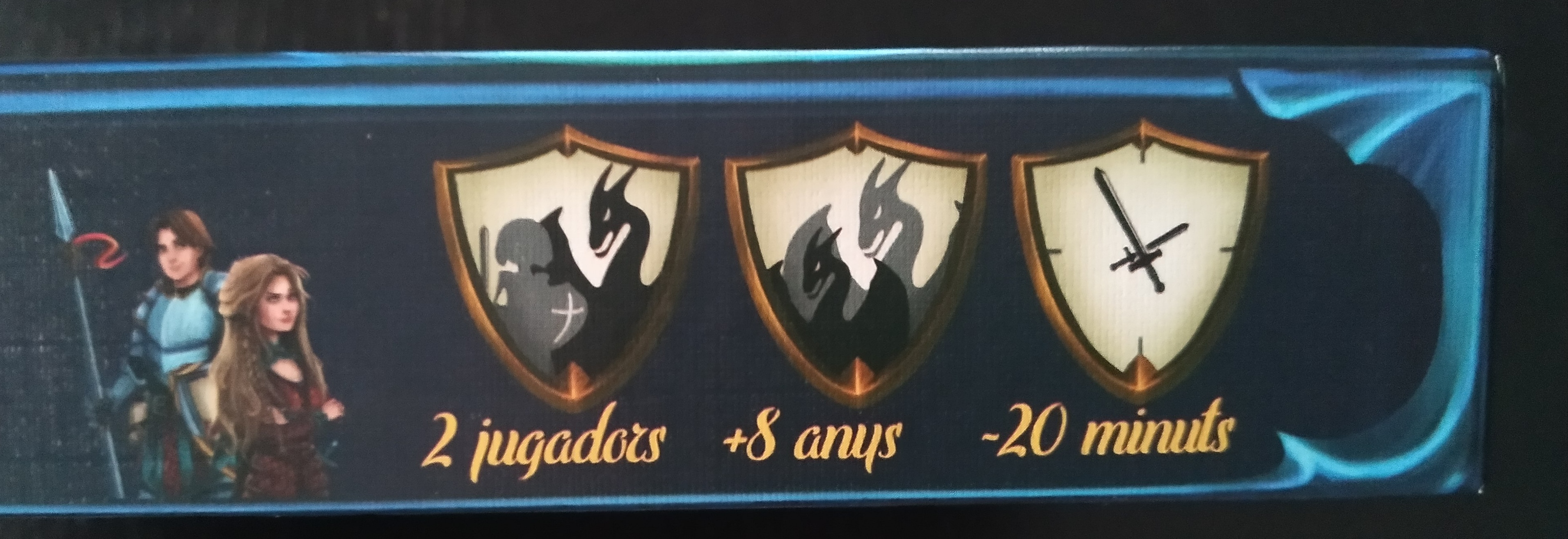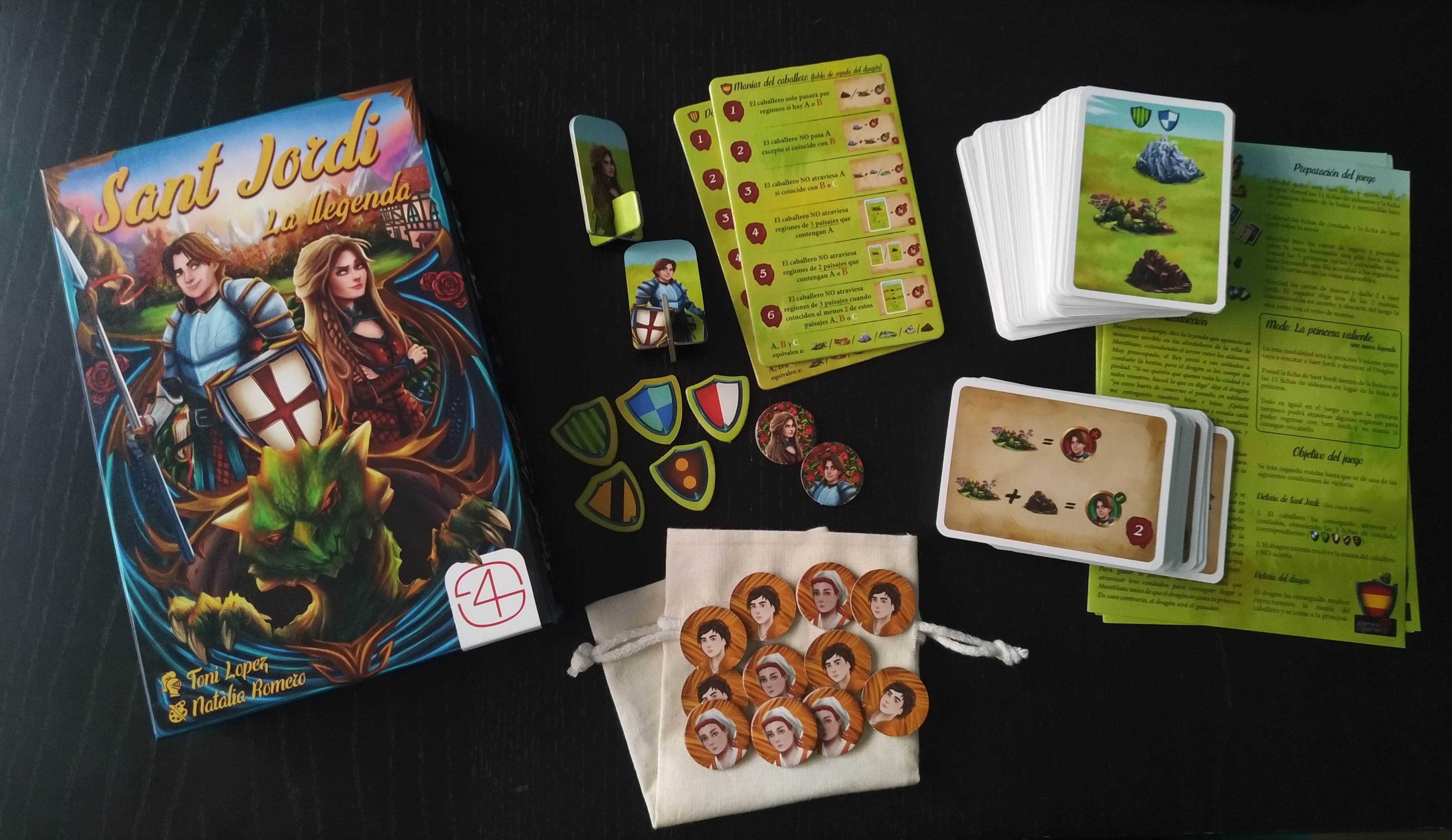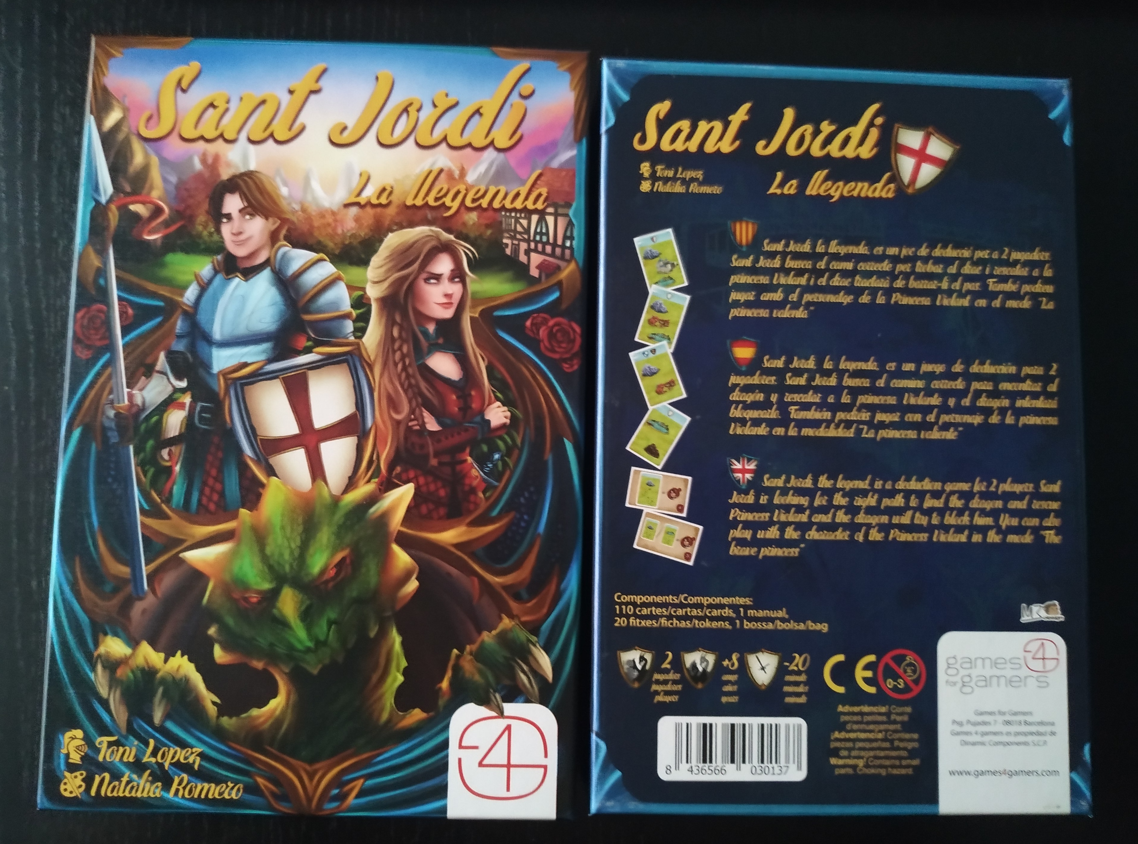 Se nos presenta en una caja mediana y muy colorida en cuya portada vemos a los 3 protagonistas principales: Sant Jordi, la princesa Violante y el dragón. Editado en 3 idiomas (español, inglés y catalán) en el reverso vemos los textos en dichos idiomas así como en el interior las reglas y las losetas de ayuda que también vienen traducidas.