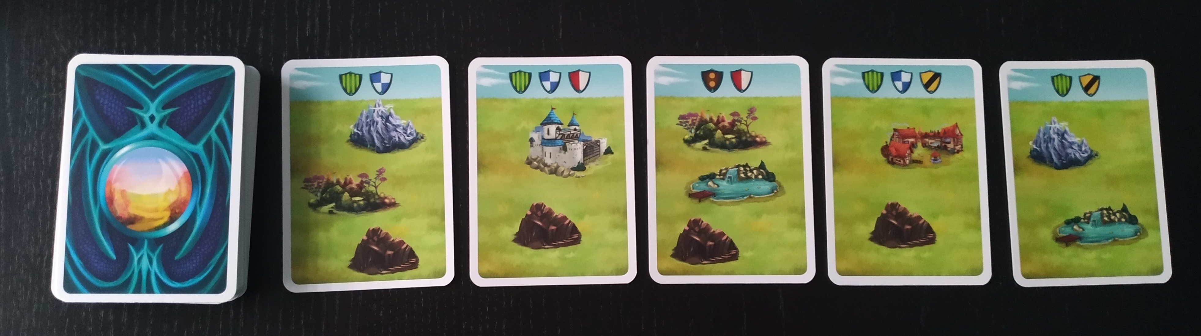 Barajamos las cartas de región y dejamos un mazo bocabajo del que desvelaremos las 5 primeras y las colocaremos formando una fila accesible para todos. Éstas 5 cartas serán las rutas que haya disponibles.