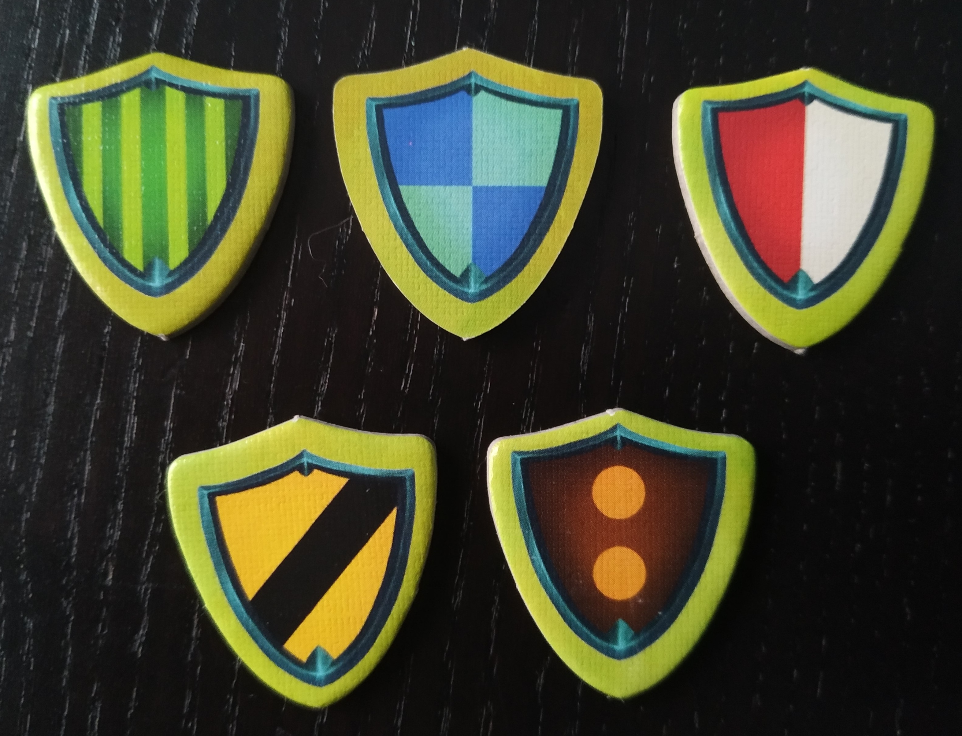 Según avancemos el camino en los diferentes turnos de viaje, deberemos ir sumando los escudos que superamos para parar cuando consigamos atravesar 5 del mismo tipo. En ese momento habremos cruzado ese condado y cogeremos la ficha de escudo que hayamos conseguido.