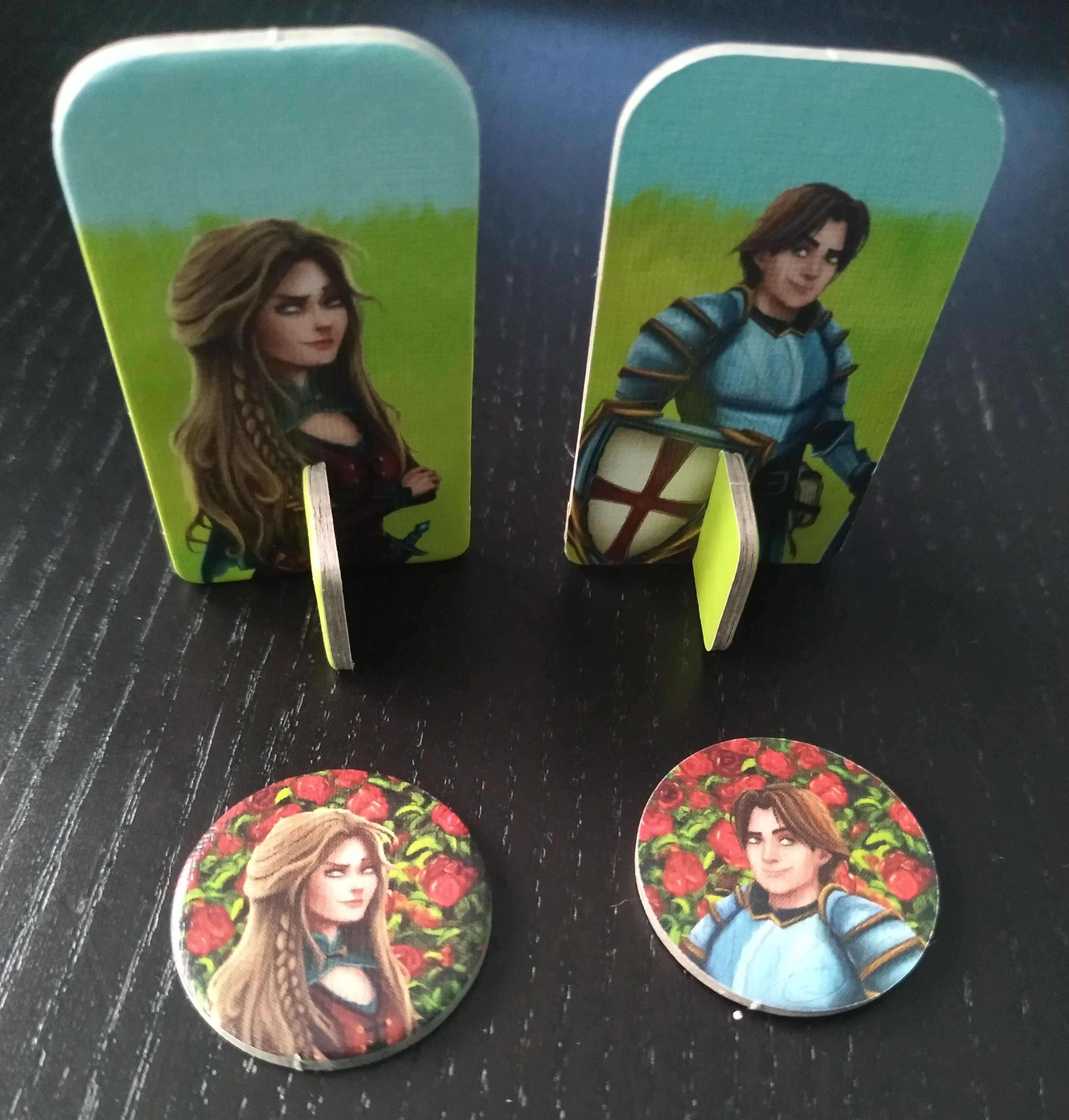 Otra cosa que nos ha gustado son las fichas de condado teniendo que recopilar varios escudos del mismo tipo para poder obtener la ficha que lo representa simbolizando así el avance por lo caminos y la posible victoria de Sant Jordi al aventurarse a rescatar a la princesa.