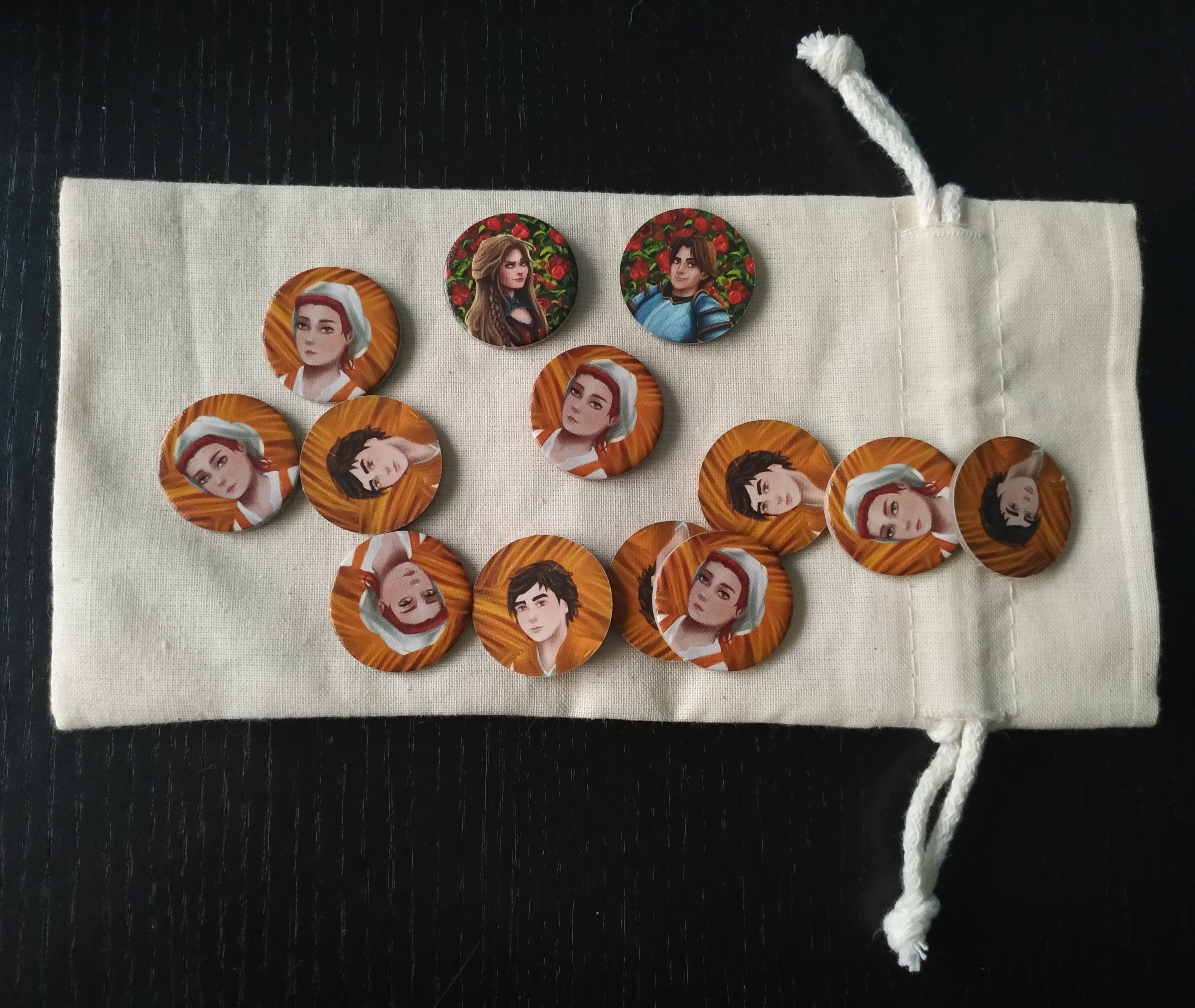 Primero elegiremos un rol de los 3 disponibles: Sant Jordi, Violante o dragón. Pondremos las fichas de aldeanos en la bolsa junto a la del príncipe o princesa (la que no hayamos elegido) y las mezclaremos.