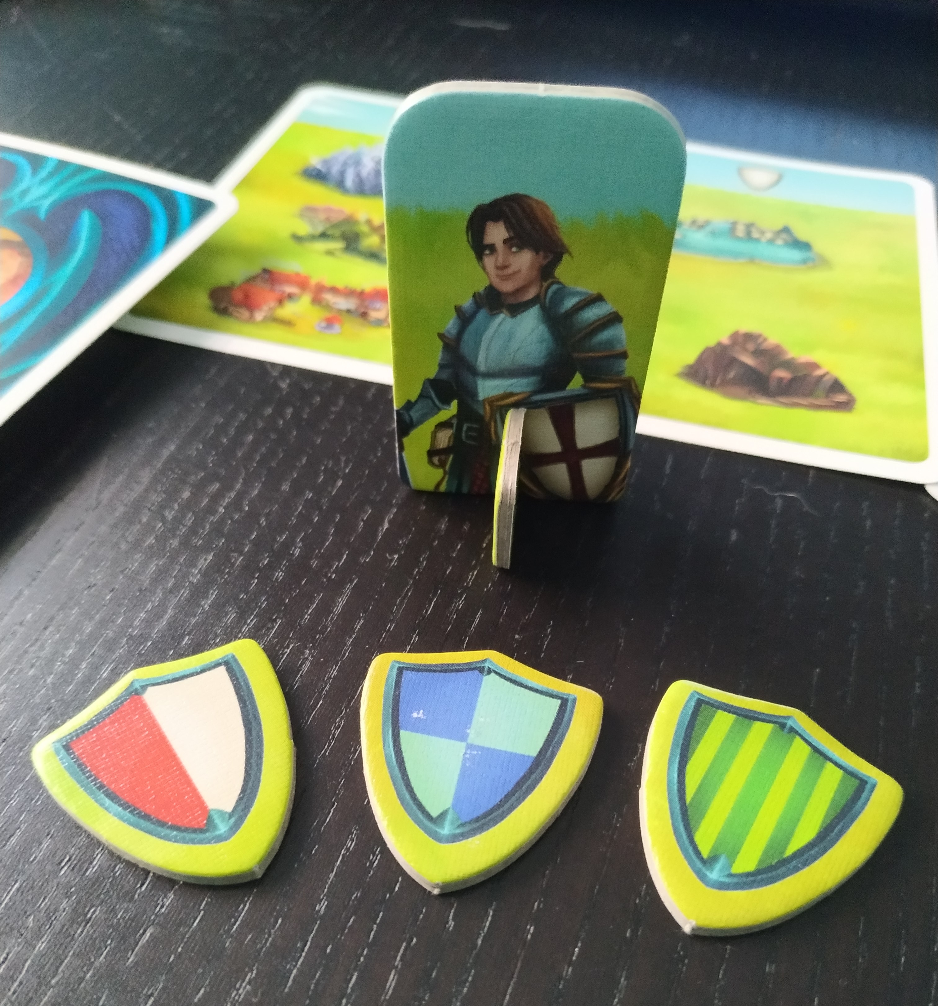 Habrá que saber qué cartas escoger de las 5 disponibles pensando en no dejar clara la manía desde un principio a la vez que nos fijamos en los escudos que iremos sumando si esas cartas no bloquean el paso para poder conseguir las fichas de escudos de condado. Por otro lado, si hemos elegido el rol de dragón, nuestra misión será estar todo el rato atentos a las cartas que coloca el oponente para colocar nosotros las que bloqueen su paso y así, además de adivinar su manía, poder sacar fichas de la bolsa para poder tener la suerte de coger la que representa al príncipe o princesa que debe rescatar y tener la oportunidad de poder resolver.