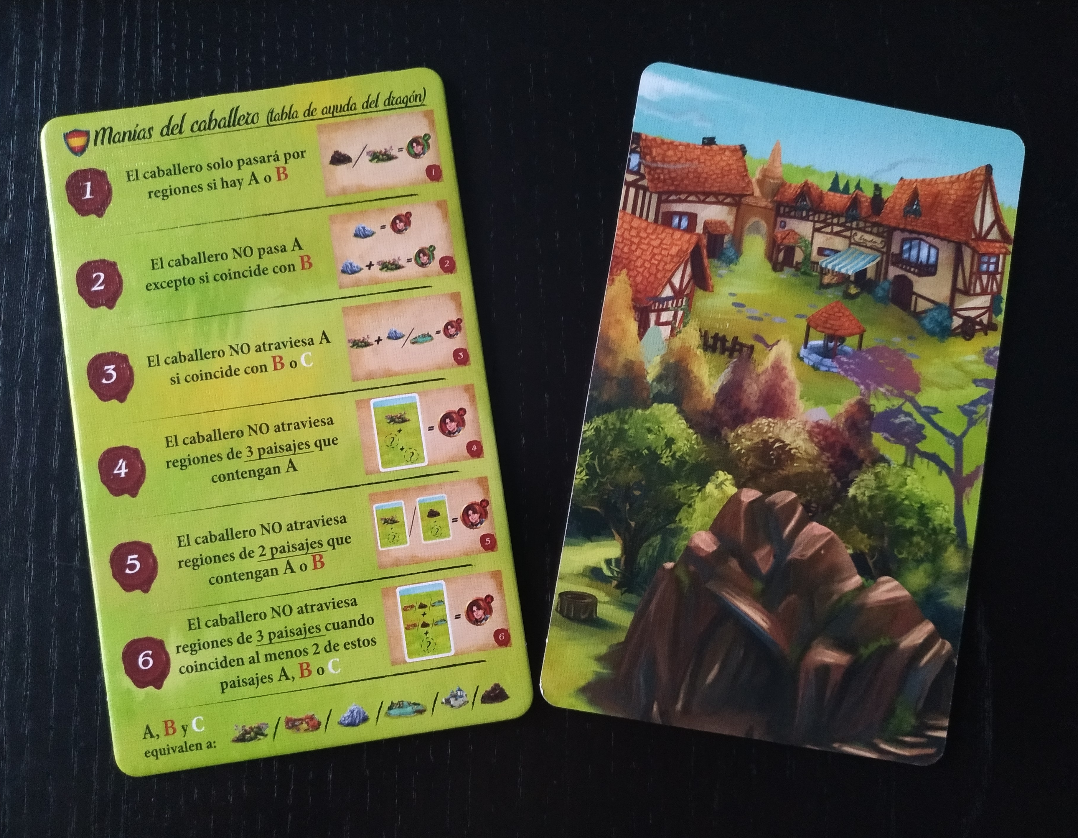 Cogeremos 5 cartas del mazo de región y las sumaremos a las 5 de ruta que haya disponibles. De esas 10 cartas, el dragón seleccionará todas las que crea que bloquean el camino del príncipe o princesa o, si no hay ninguna, lo indicará. El humano desvelará su manía para poder comprobar la apuesta del dragón.